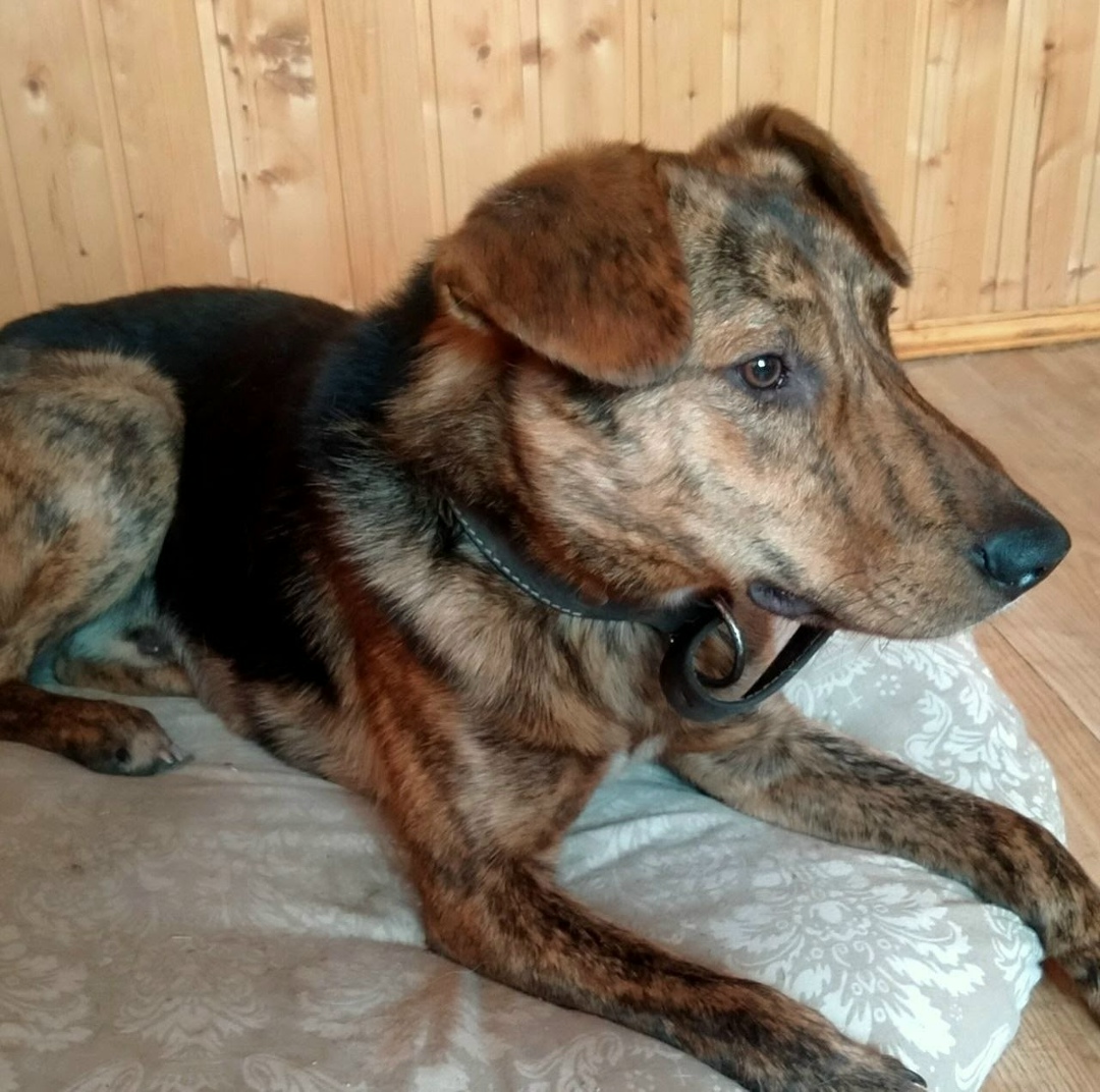 Мишка спасённый пёс из леса на Донинском шоссе. Небольшой,окрас чёрный с тигровым, кожаный ошейник с металлическими вставками.