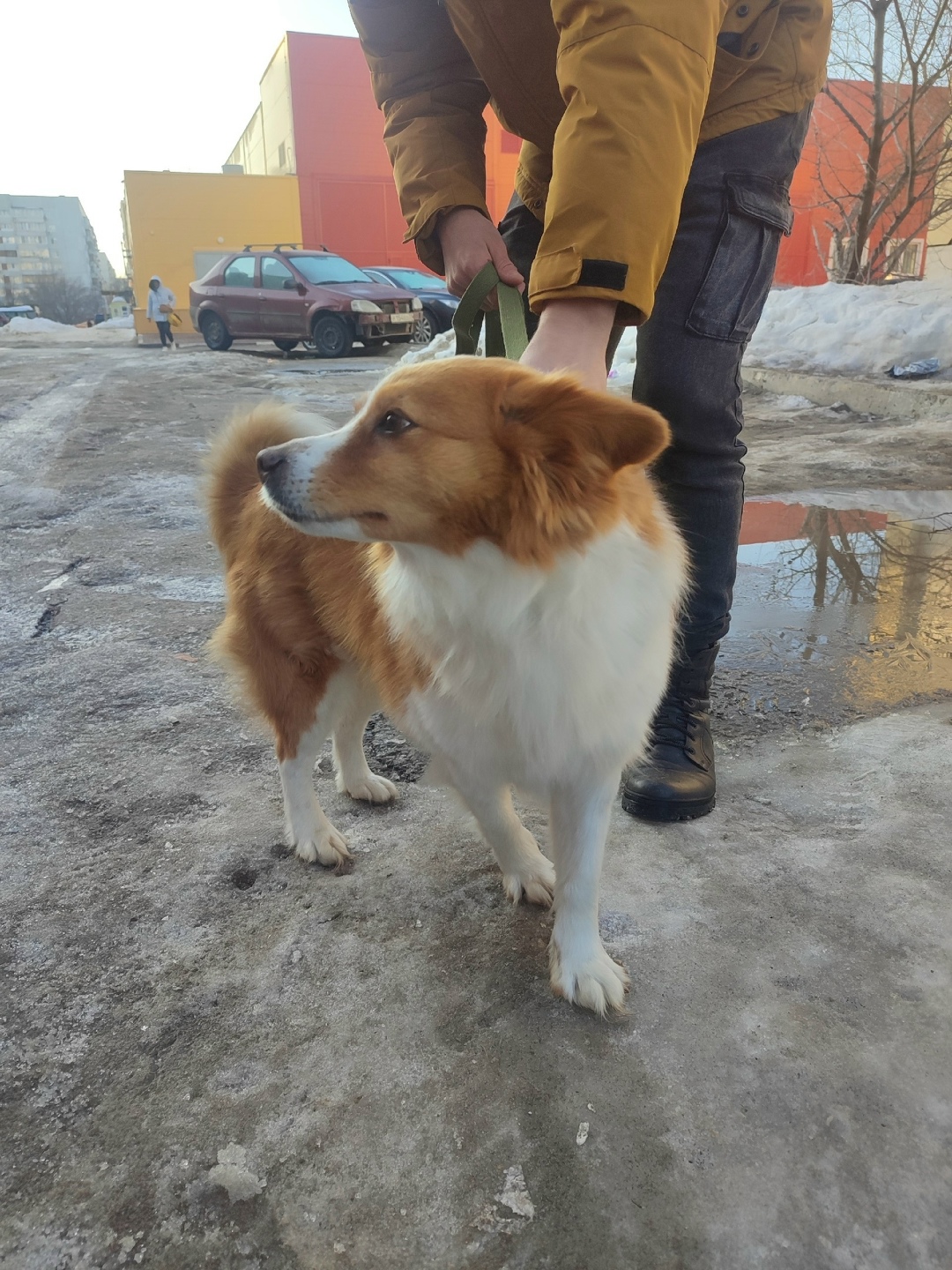 Нашли собаку в районе улицы Любови Шевцовой , на севере. Кобель, бело-рыжий окрас. Есть ошейник, но без контактов хозяина.