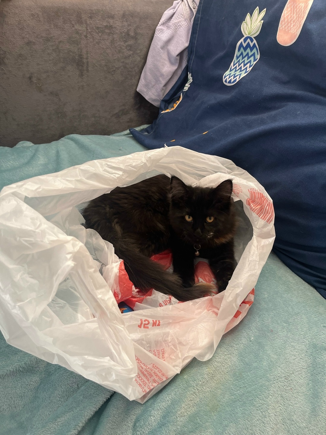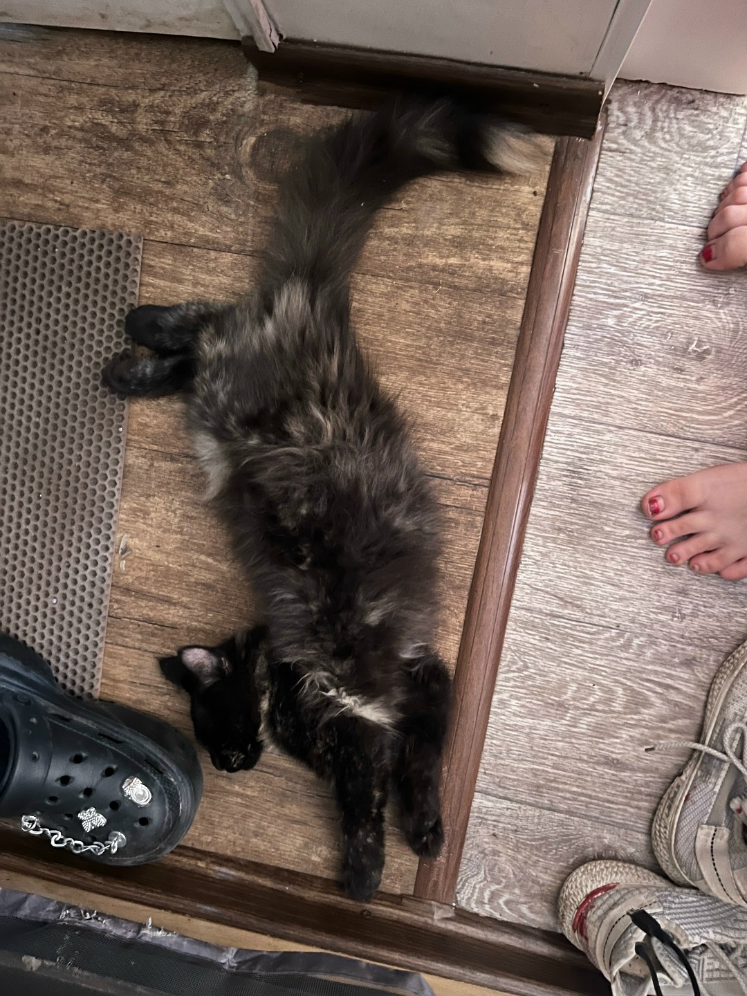 Небольшого размера порода Майн-Кун , всего пол года , чёрная с рыжими пятнами, на хвосте кисточка