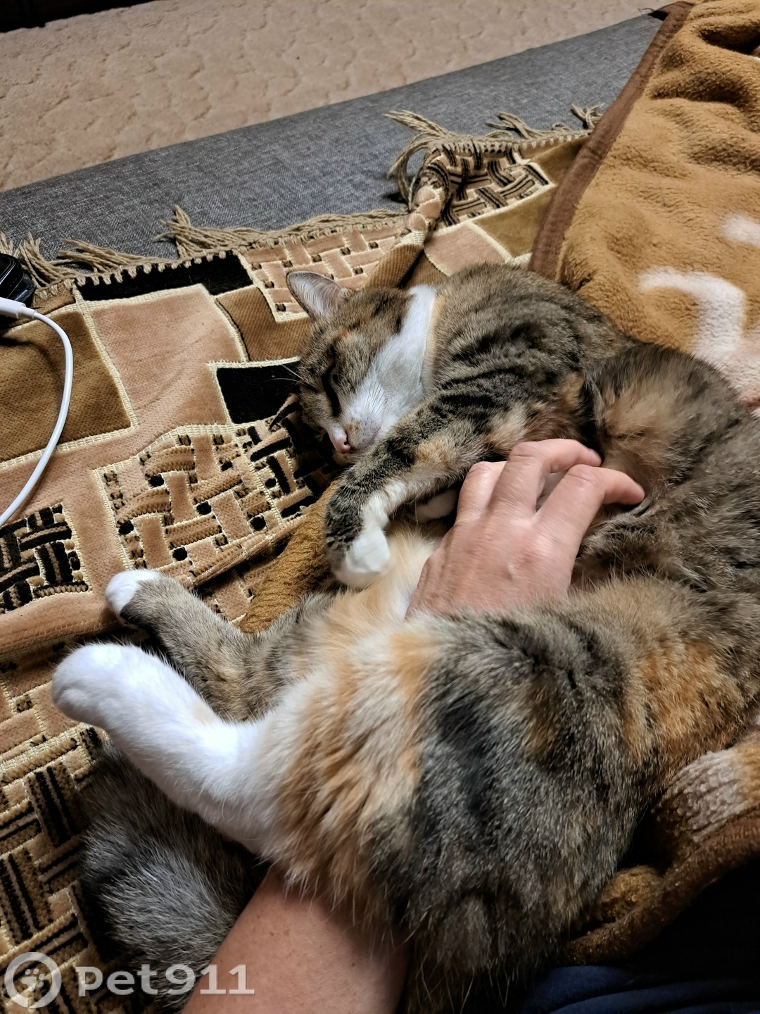 Выбежала из подьезда.Кошка домашняя, стерилизавана. Окрас табби, с рыжими пятнами, белая грудка и лапки