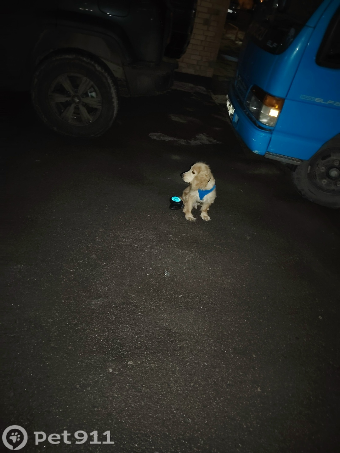 Сидела возле между двумя машина рядом с площадкой, адрес указал. Приметы: спаниэль синяя шлейка оранжевый цвет