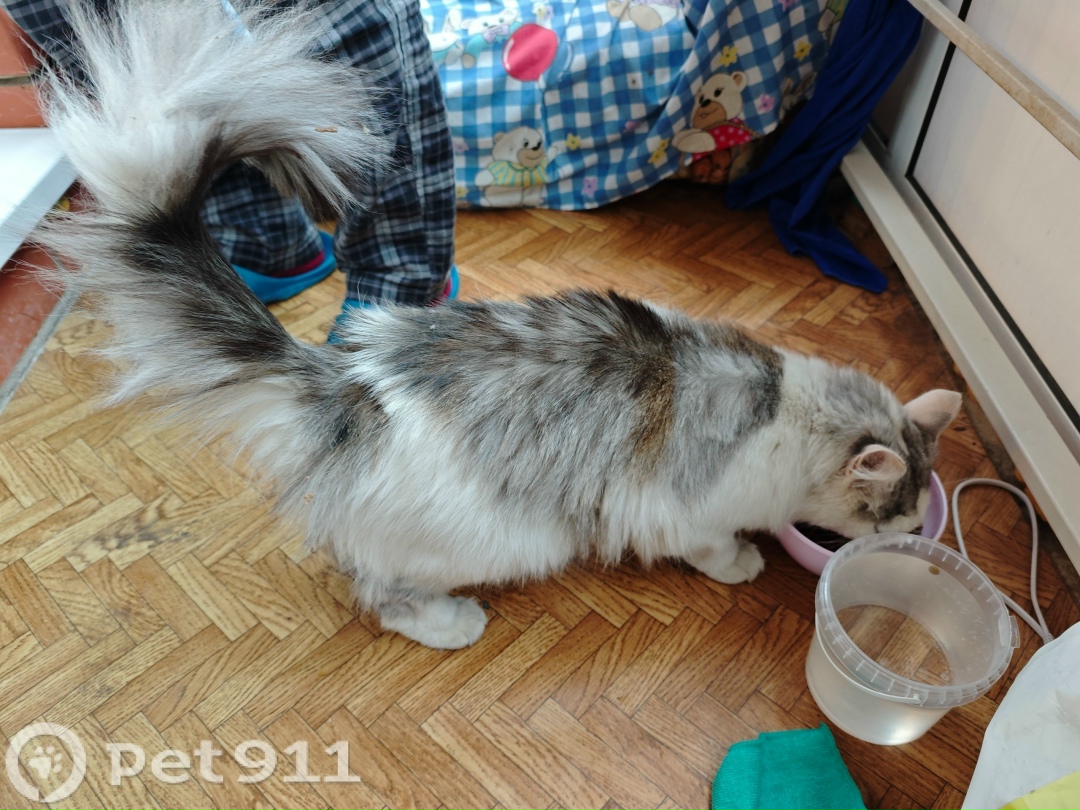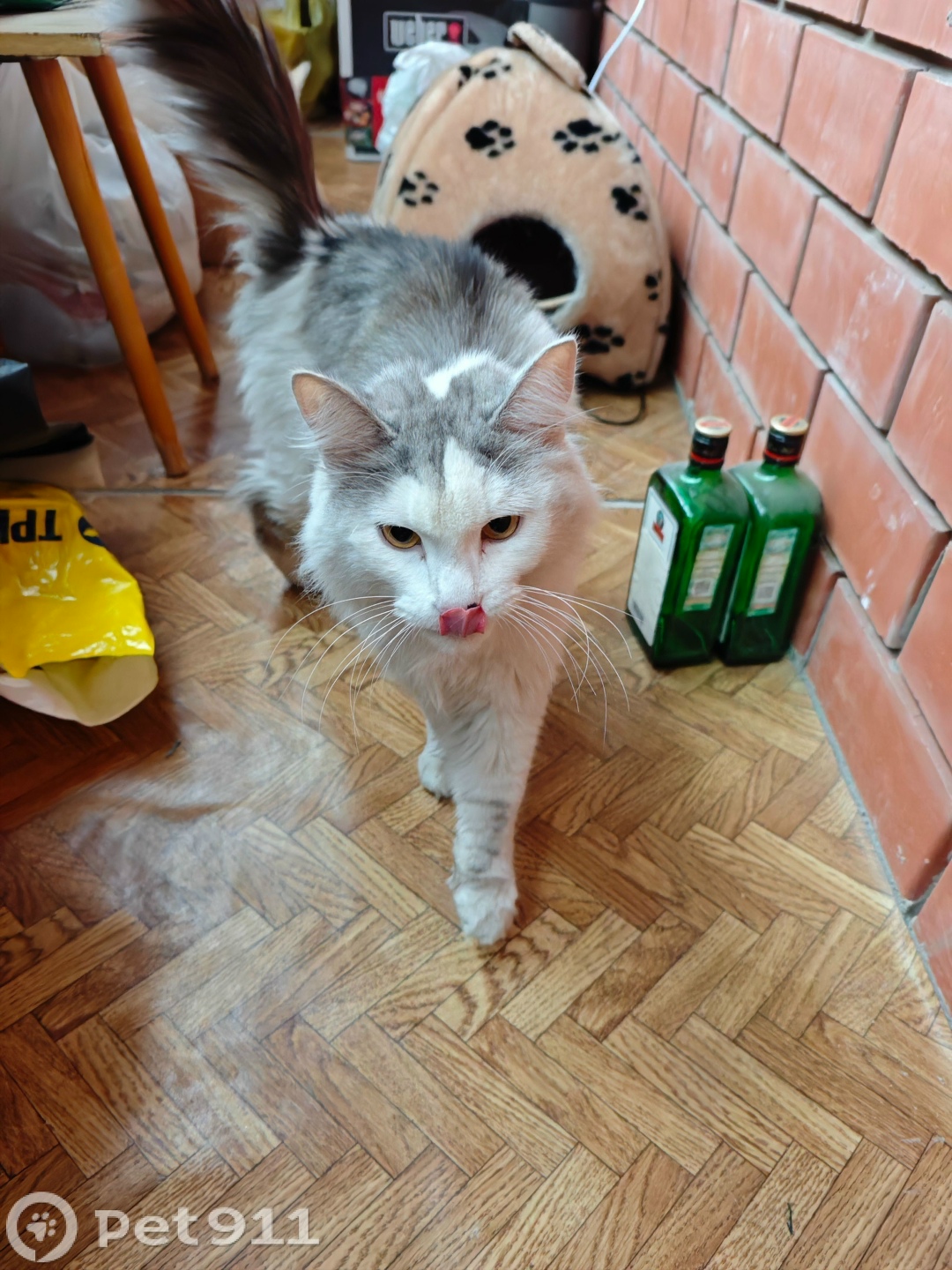 Кошка найдена во дворе дома, сидела под машиной. Окрас бело-серый. На носу чёрное пятнышко