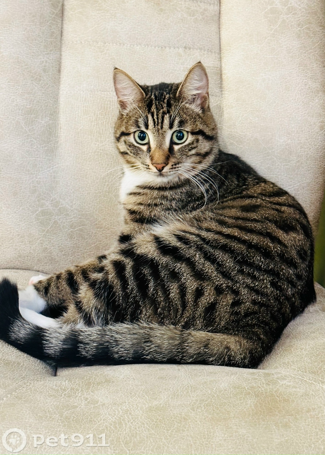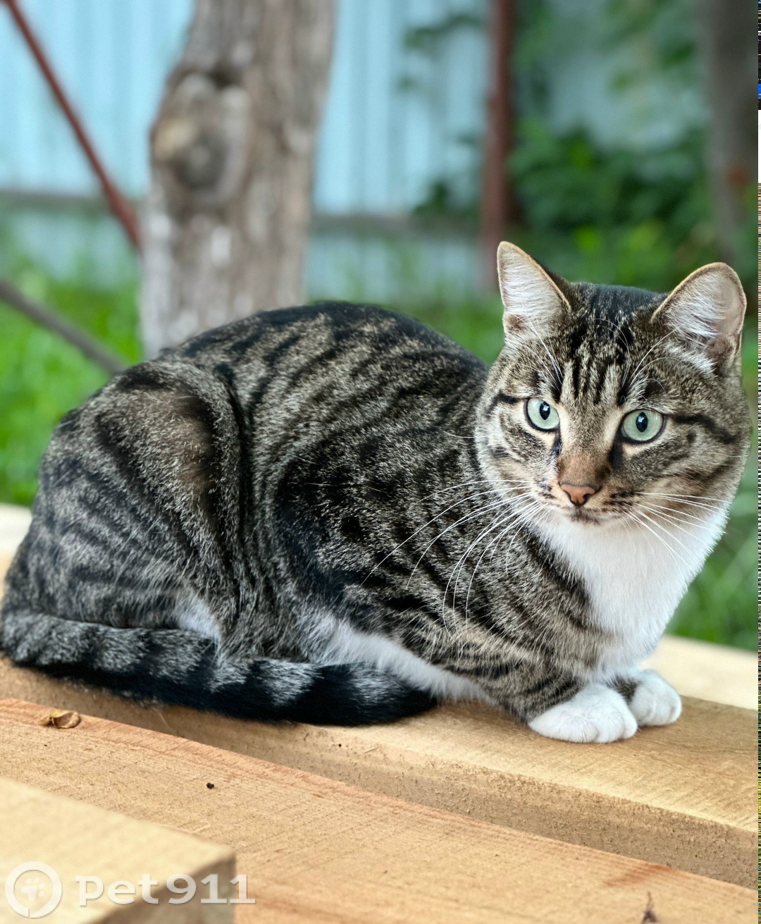 Окрас табби (яркие, чёткие пятна и полосы), гладкошёрстный , грудь, живот и 4 лапы (как в тапочках) белые. Утром вышел на прогулку и больше не возвращался.