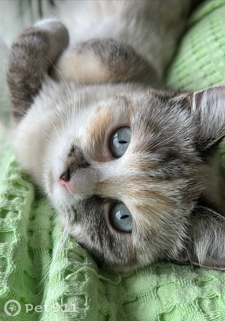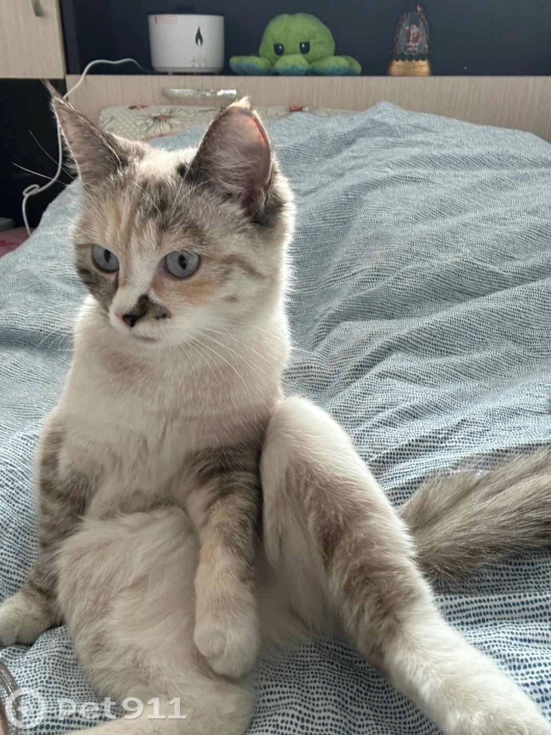 Основной цвет белый и бежевый, черные пятнышки и полосатый хвостик. Носик на половину розовый, другая половинка черная