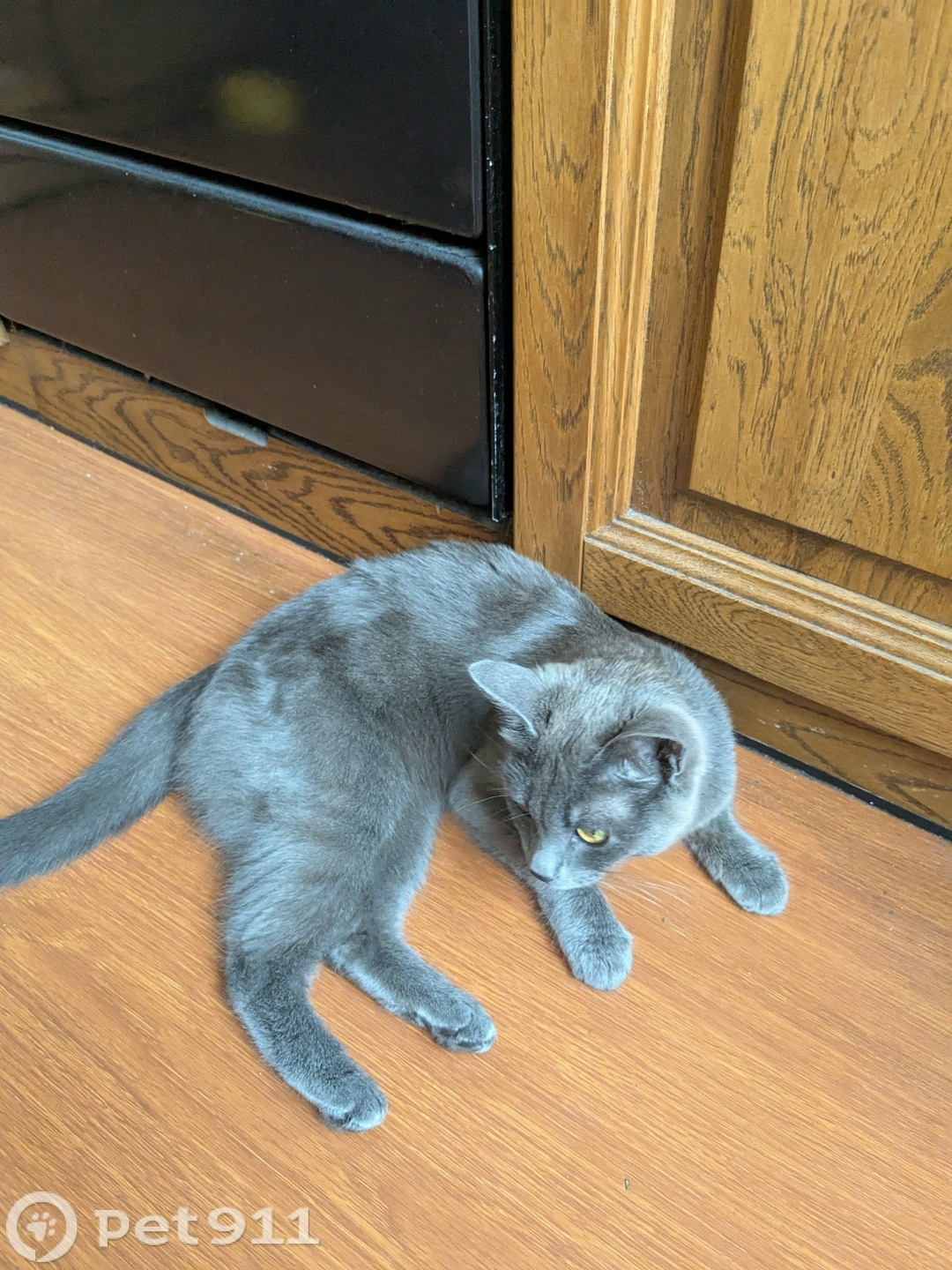 Серая кошка, глаза жёлтые, худая, короткая шерсть, ласковая, разговорчивая