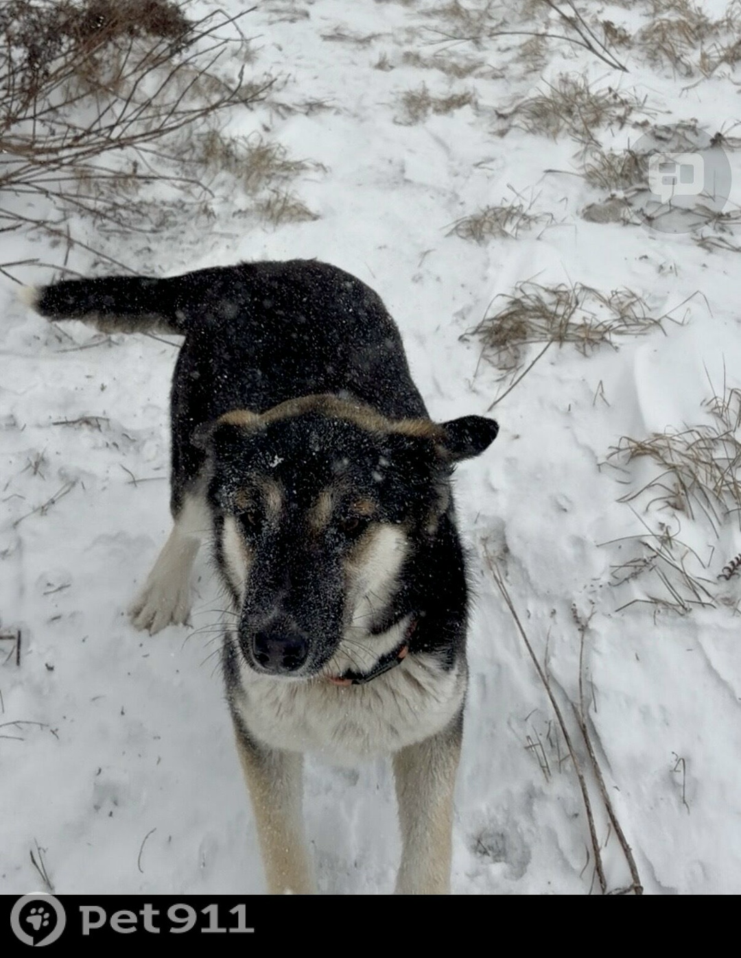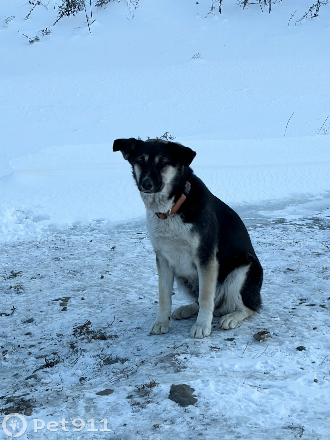 Темная спина , светлые лапки . Оранжевый ошейник . Собака пришла на территорию на русском острове в метел .