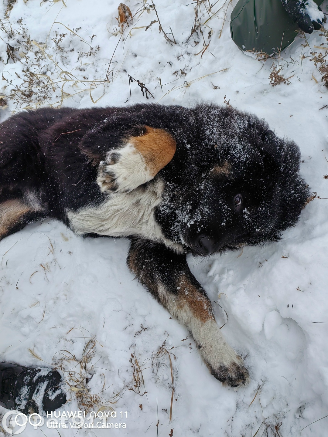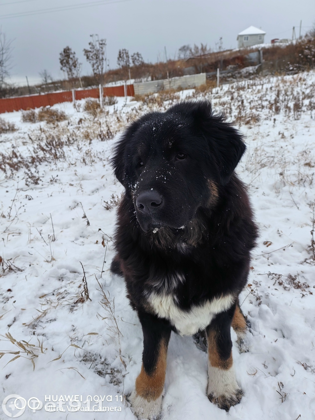 Черный, крупный, лохматый с белой грудкой, чуть рыжие лапы с белыми пальцами, уши висят, глаза грустные, с ошейником, трусливый, на кличку может не отозваться