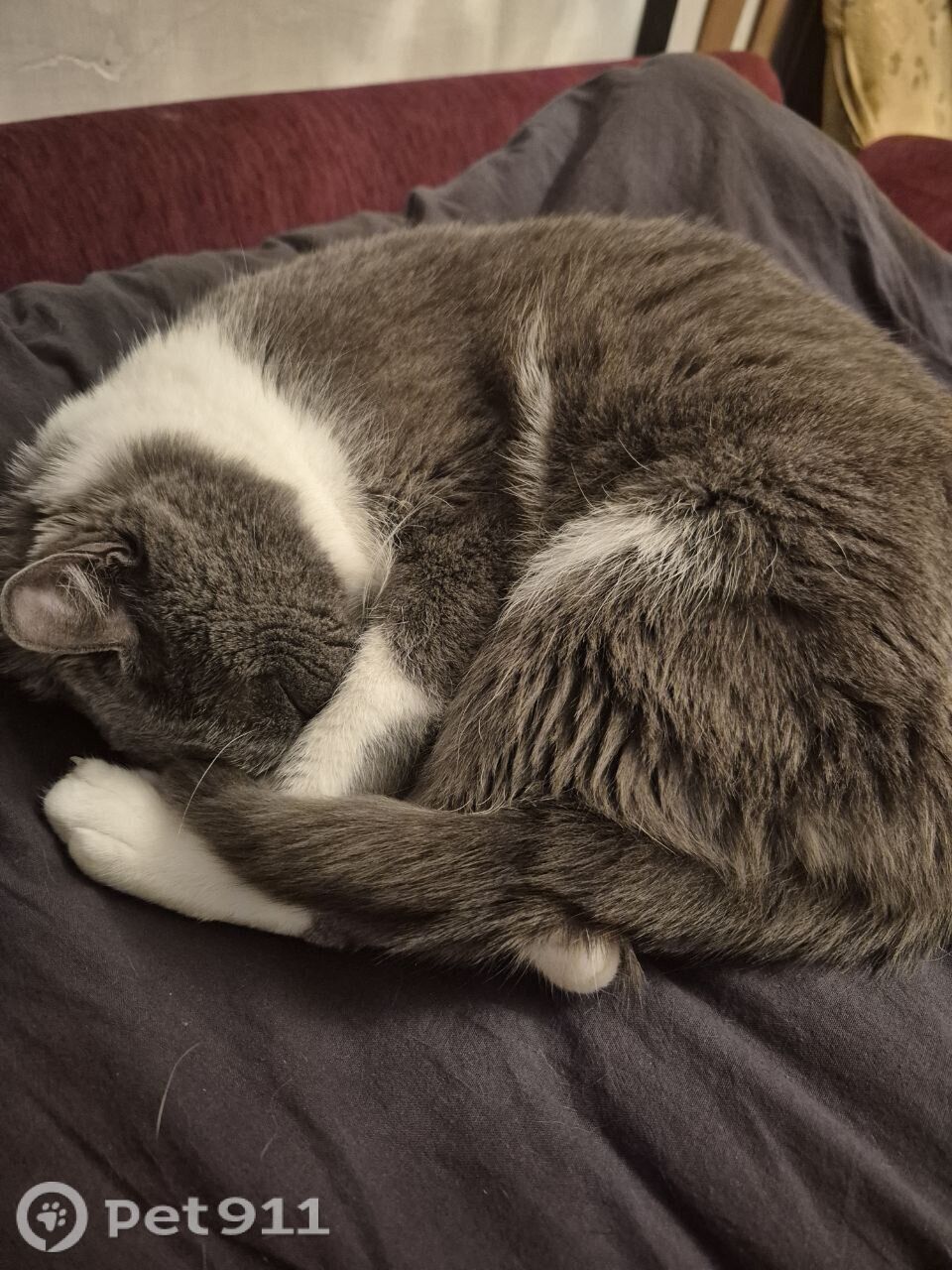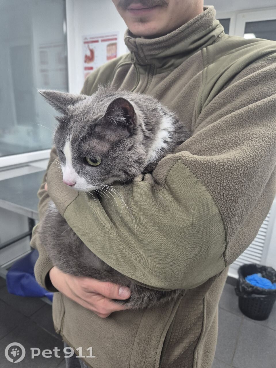 Серый, мордочка белая, выбежал из квартиры, далее, скорее всего, его выгнали из подъезда, так как он очень громко «кричал» он возрастной, недавно вырвали ему больной клык ему очень нужно лечение! Пугливый, мог где-то «заныкаться», но всё обследовали, никаких признаков «нового дома» не обнаружили