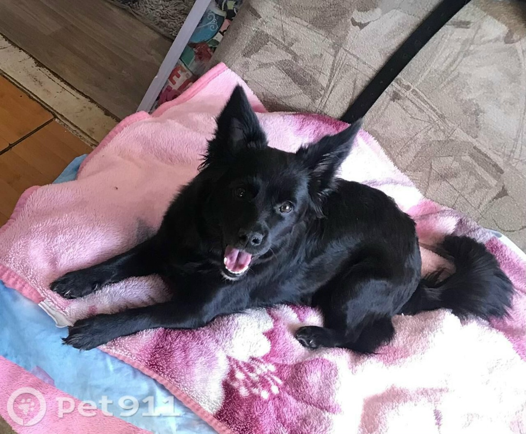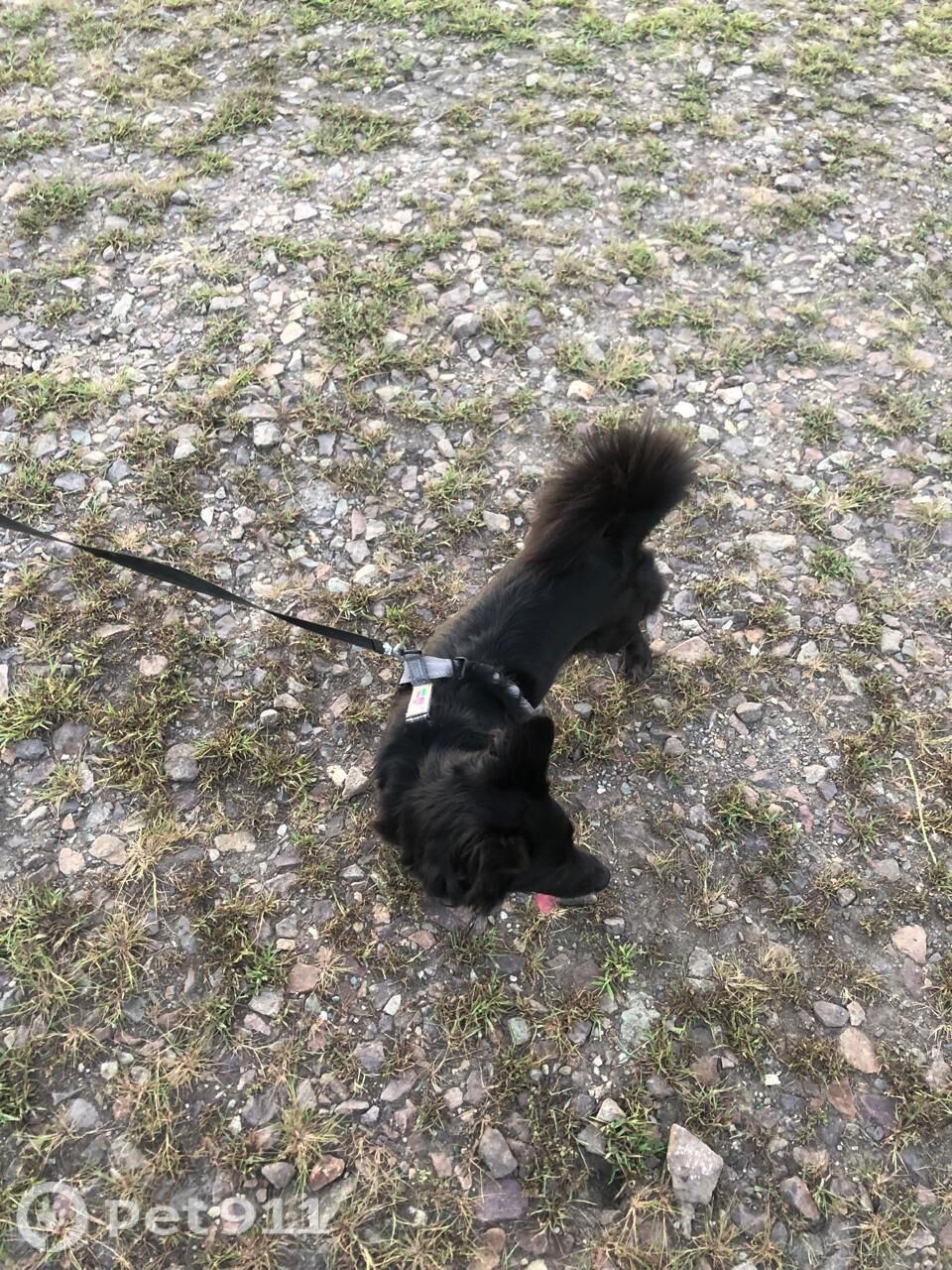 Полностью черная собака, среднего размера, на ней была шлейка серого цвета. Пугливая. Убежала вместе с коричневым псом.