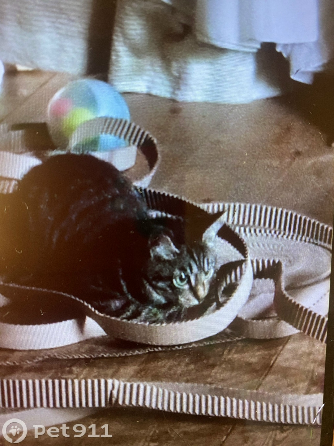 Серая в полоску . На шее фиолетовый ошейник. Кошка небольшого размера ( котенок 7 месяцев) . Очень ласковая , любит мурлыкать. Может находиться далеко от дома .Есть вероятность, что ее увезли. Рядом остановка. Приютившим или видевших ее , просьба позвонить хозяевам.