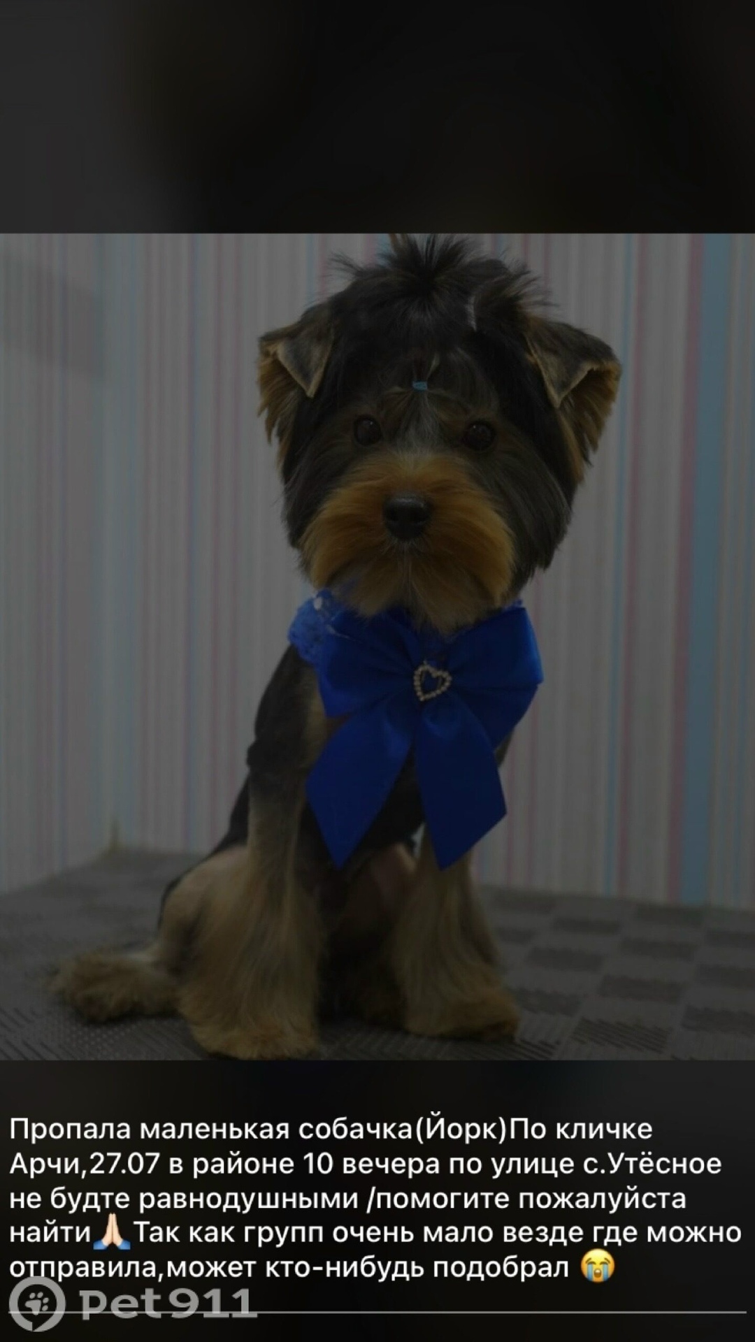 Йорк, маленького роста , двухцветный окрас (чёрный бежый). Выбежал , пока дверь была открыта в районе 10вечера. Шустрый, послушный на кличку отзывается, короткая стрижка