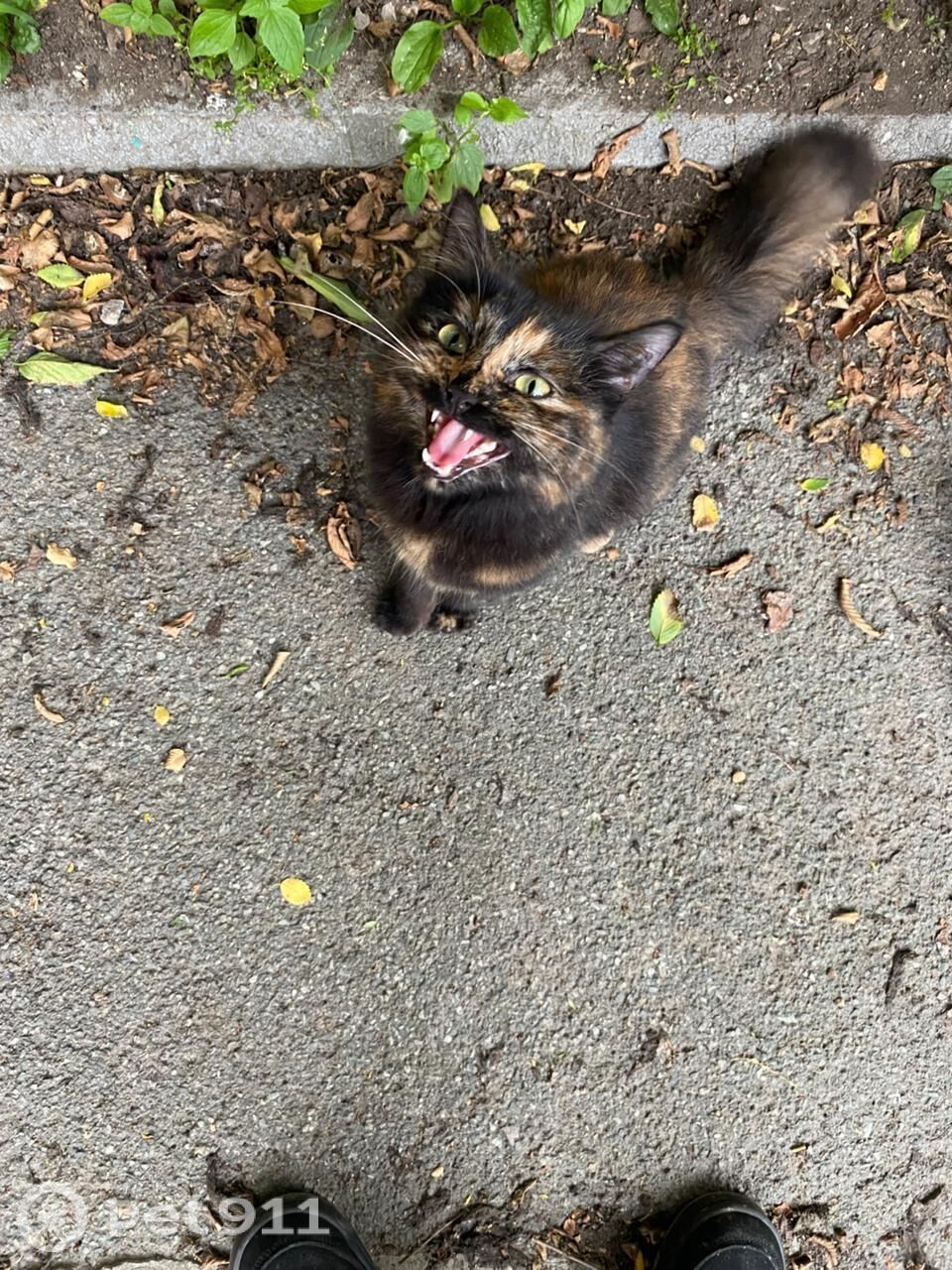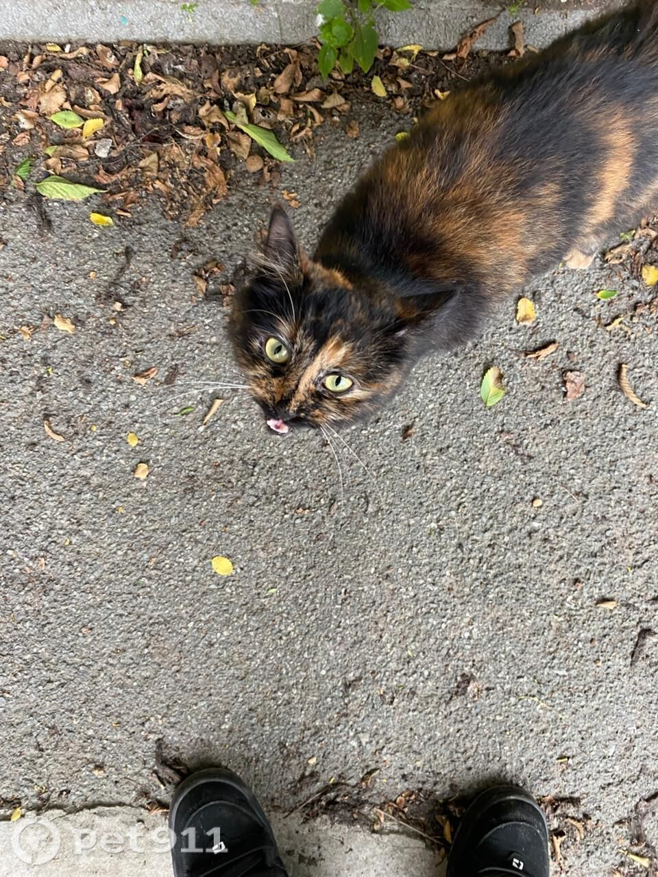 Кошечка гуляет одна , окрас черепаховый , видно , что домашняя и потерялась , очень ласковая , спокойная .
