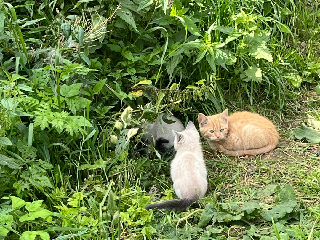 Трехцветная и светло-бежевая-девочки,светло-бежевый с рыжим хвостом-котик,2 котенка -окрас похож на сиамскую породу,голубые глаза,пол не знаю,не удалось их поймать,и один котенок-рыжий,предположительно,кот.Очень надеемся найти им дом,скоро холода,в деревне никого не будет...