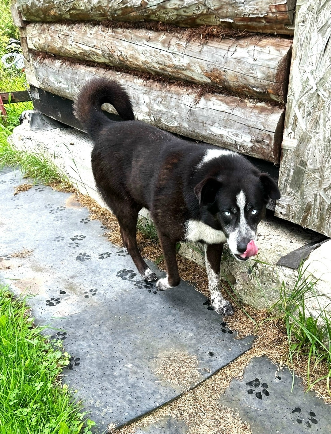 Альфа относительно молодая, ей 5 лет. Стерилизованная, здоровая, адекватная и неагрессивная собака.