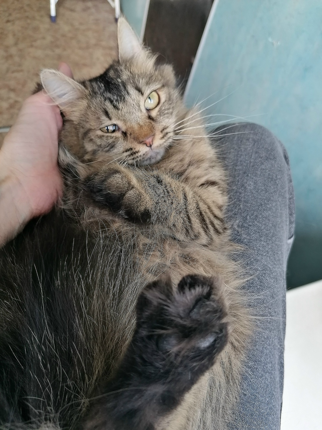 Лизавета обычного "камышового" окраса, достаточно пушистая и длинношёрстная. По характеру спокойная, любит ласку и общение с людьми, внимательно слушает, когда с ней разговаривают, и, конечно же, всё понимает.