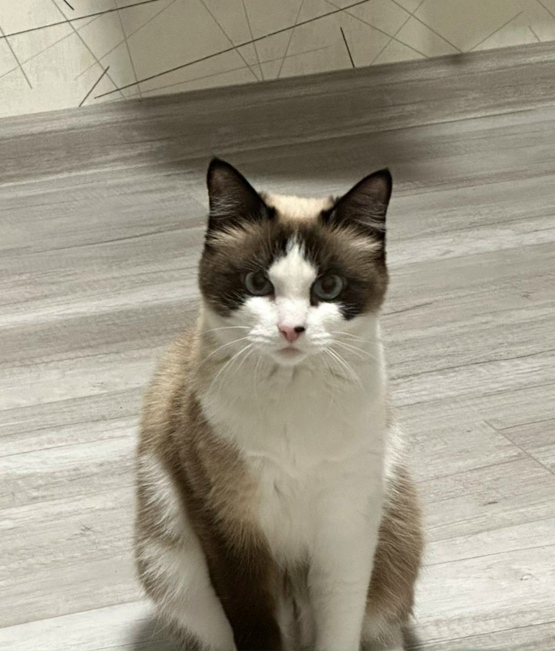 - Кошечка небольшого размера, характерные для сиамской породы отметины: тёмные уши, мордочка, лапки и хвост, светлый корпус. 1 лапка спереди светлая