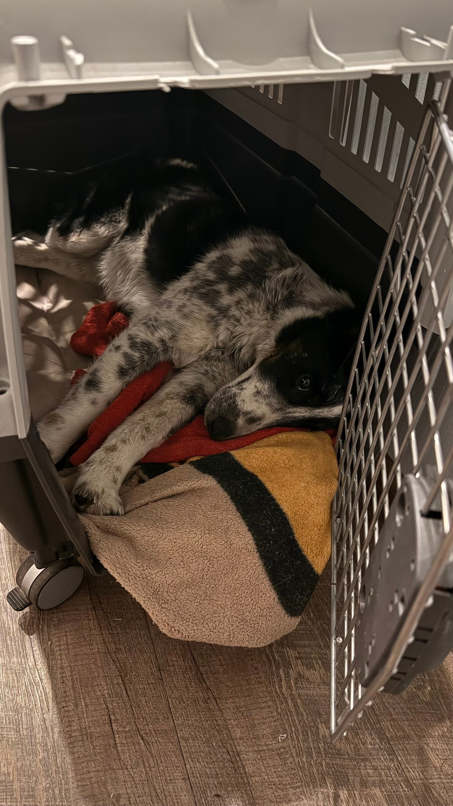 Найден и придержан кобель метис фокса (?), мерлевый (мраморный) окрас, с рыжими подпалинами на морде, без амуниции, шерсть испачкана в краске, рост около 30см в холке.
