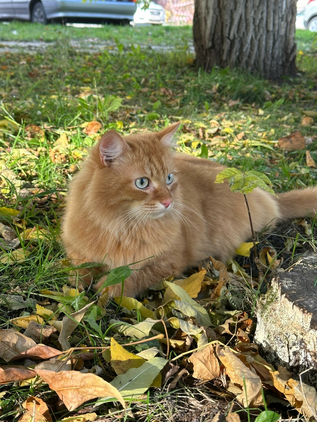 Рыжий,пушистый,не боится людей,идет ко всем и особенно к детям