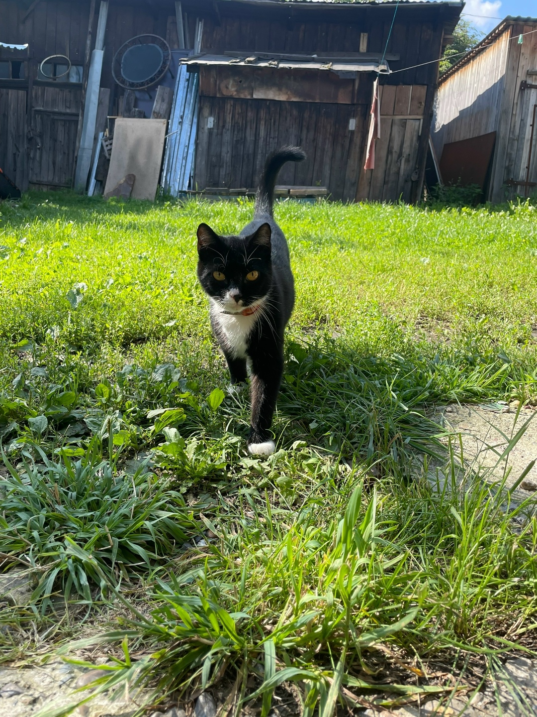 Черно белый, откликается на Марсик, на шее ошейник, стерилизован