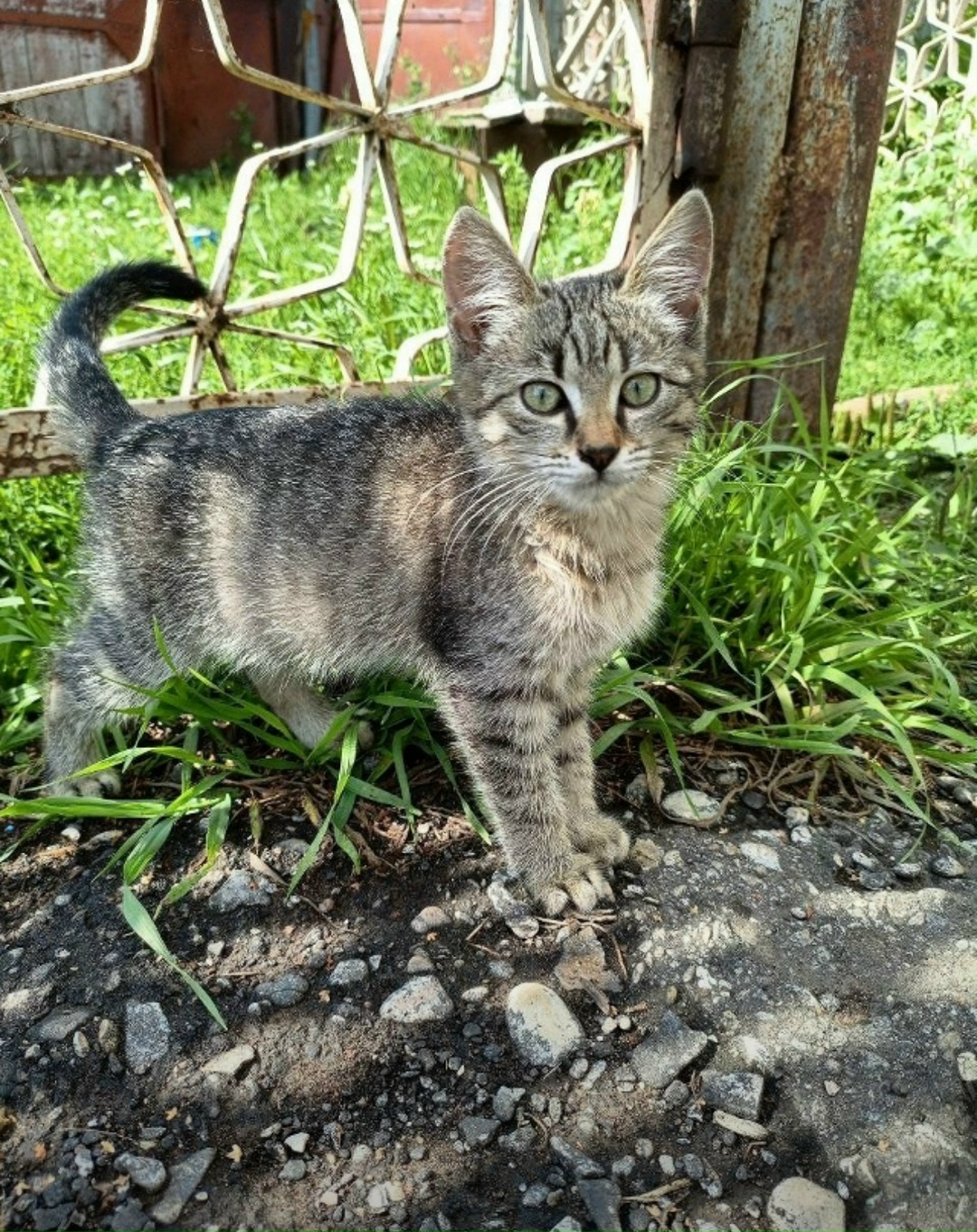 окрас серо-полосатый , зелёные глаза, маленький по размеру