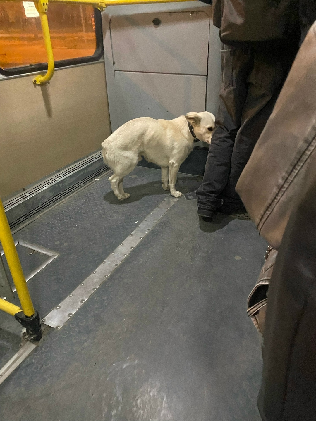 Пассажиры и водитель вежливо пытались выпроводить собаку на каждой остановке, но пёсик боялся, то прятался под сиденья, то бежал к людям за помощью.