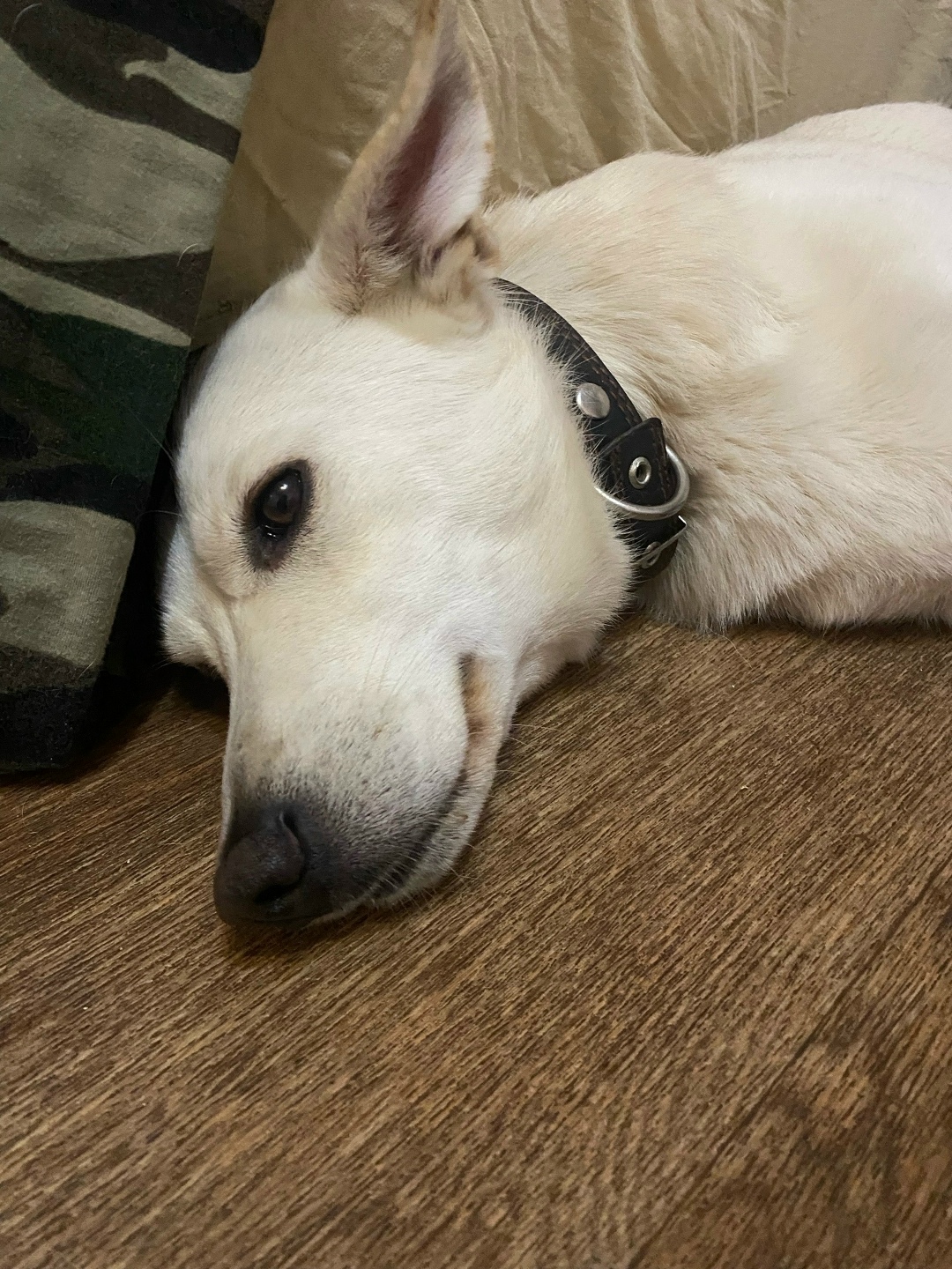 окрас белый с кремовым оттенком, на кончиках ушек кремовые пятнышки.