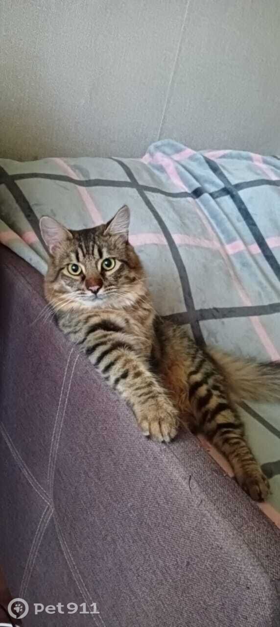 У него пол передней левой лапки отсутствует, окрас серый с коричневыми полосами, на лапках полосы. Пропал, убежал через дверь