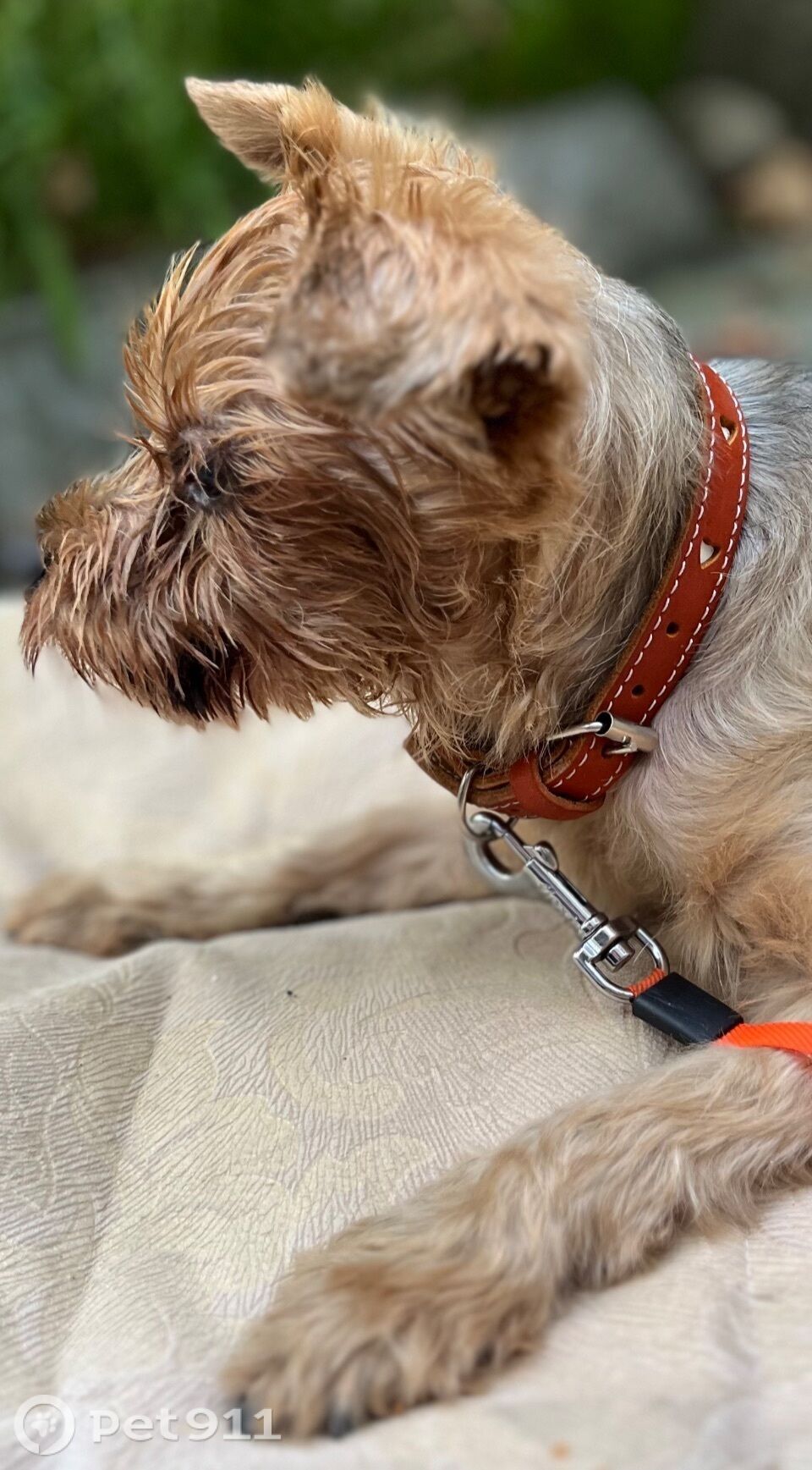 Похож на йокшерского терьера, пострижен с красным ошейником. Рыжий, шел по дороге.