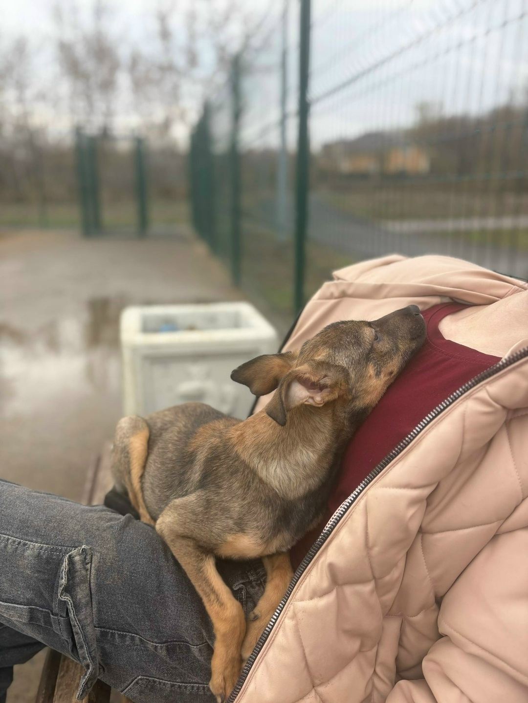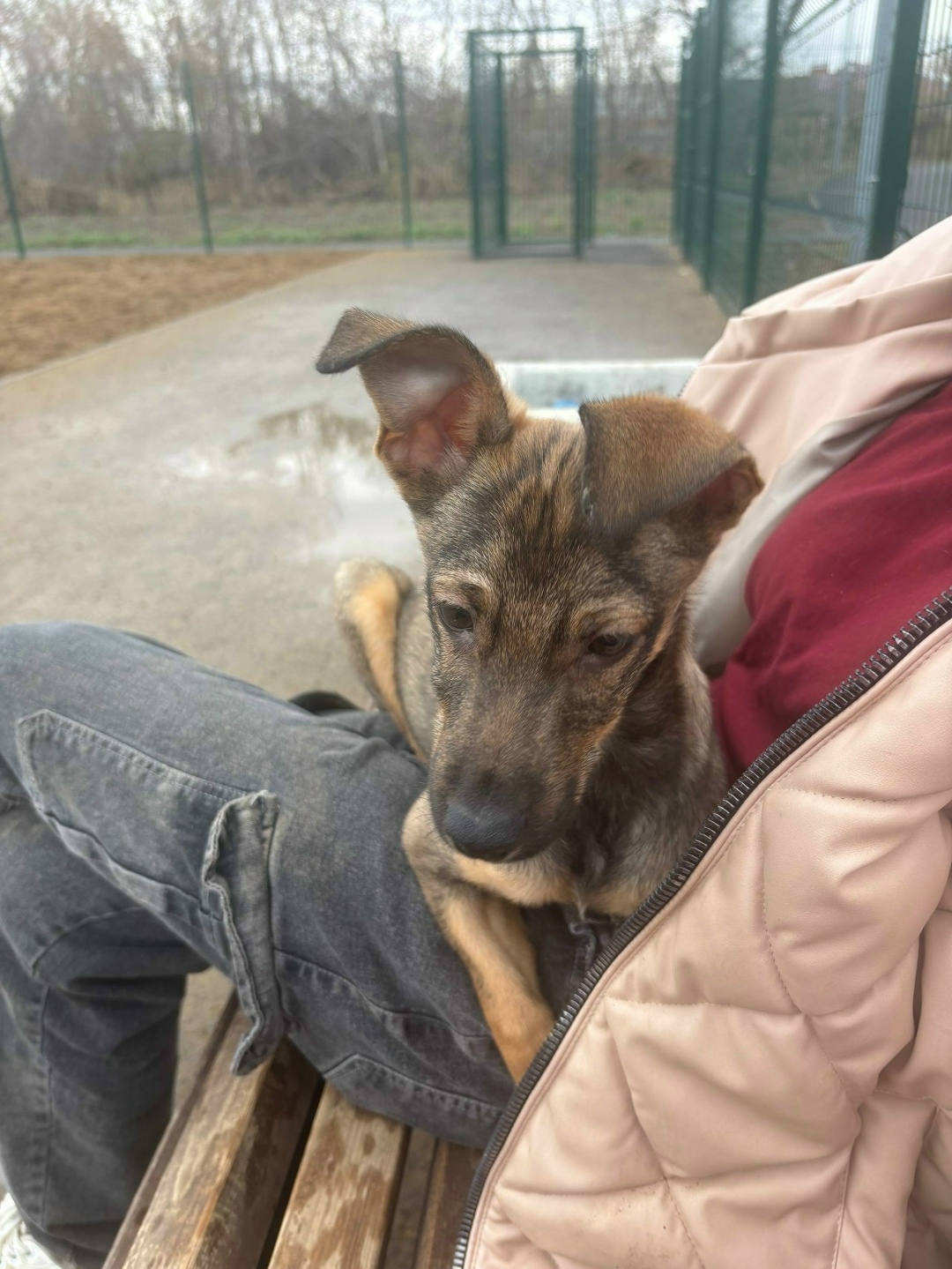нашли щенка в 6 мкрн поздно ночью вчера ,мальчик , кастрированный, в шлейке .