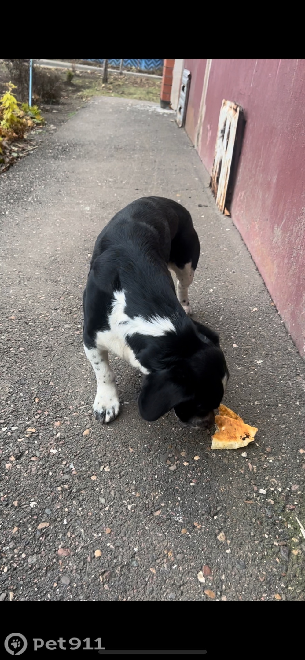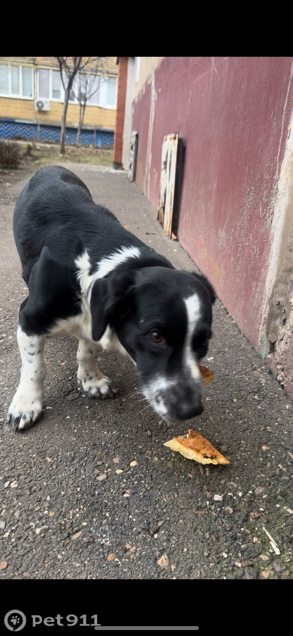 Найдена собака во дворе Салмышская 4. Ходит за машинами и людьми вокруг дома. Не агрессивная, спокойная, дается погладить. Черная в белое пятнышко, гладкошерстная
