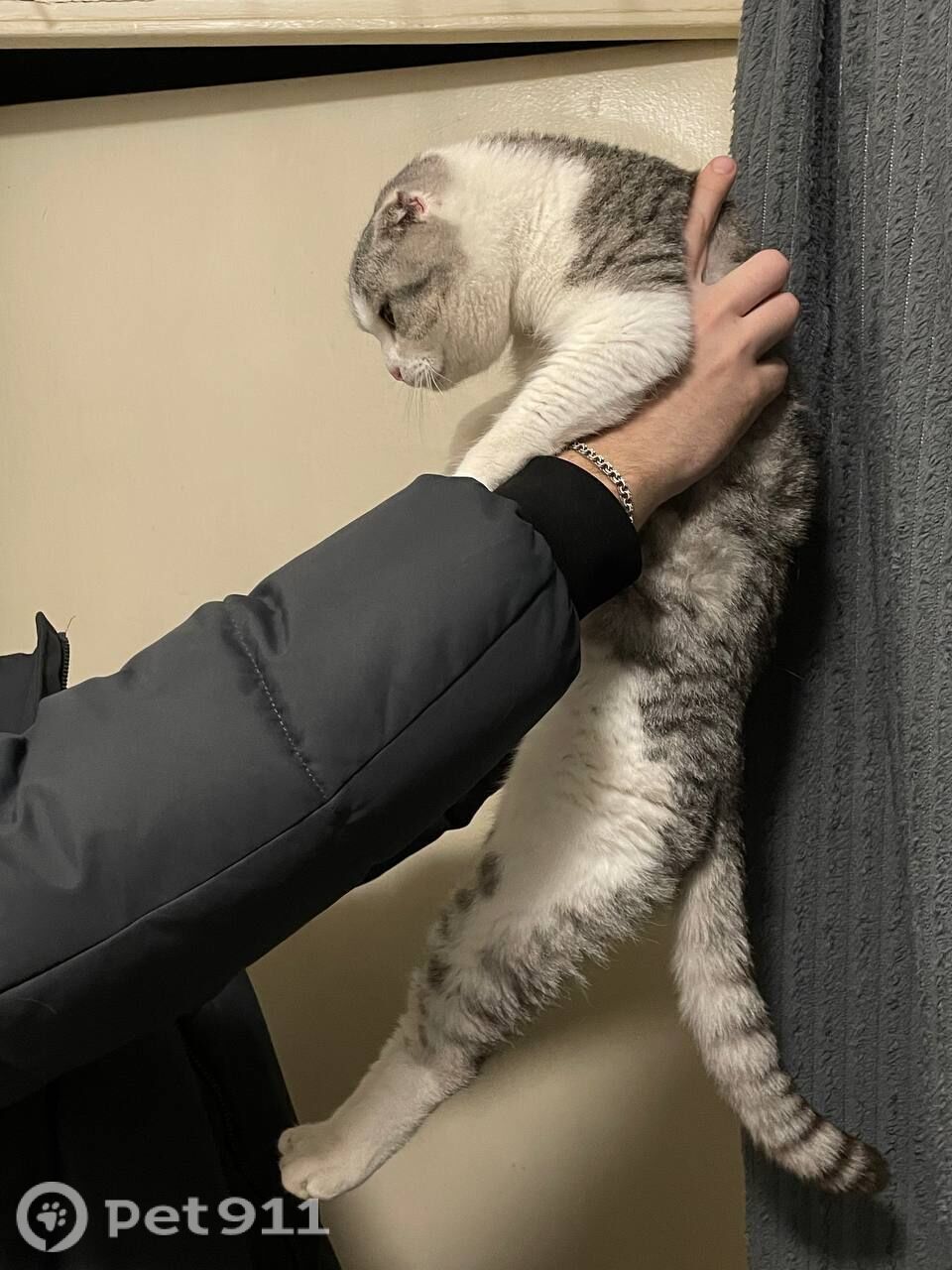 Цвет бело-серый, вислоухий, кастрированный. Сидел на парковке у ТЦ Мармелад