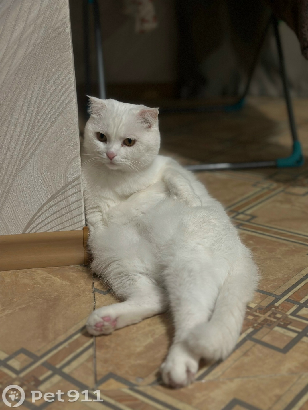 По окрасу беленький без каких либо пятен. Кот без когтей, кастрированный. Ушки маленькие, похож на вислоухого. Он небольшого размера.