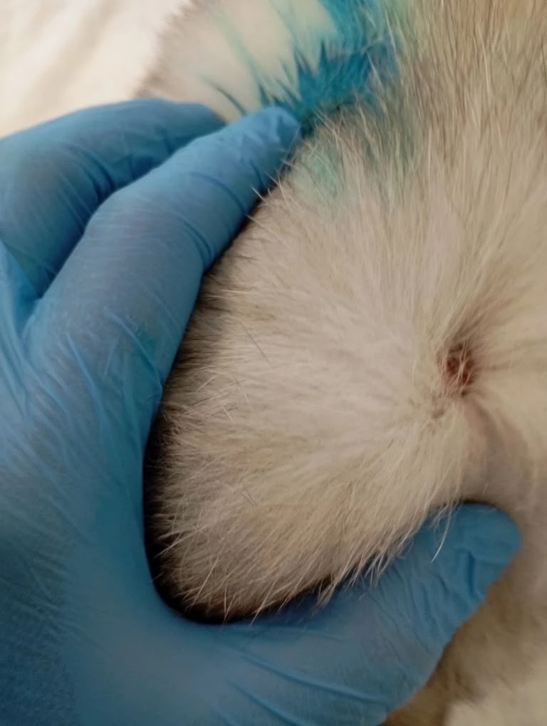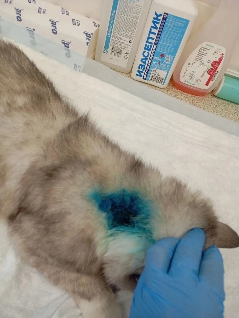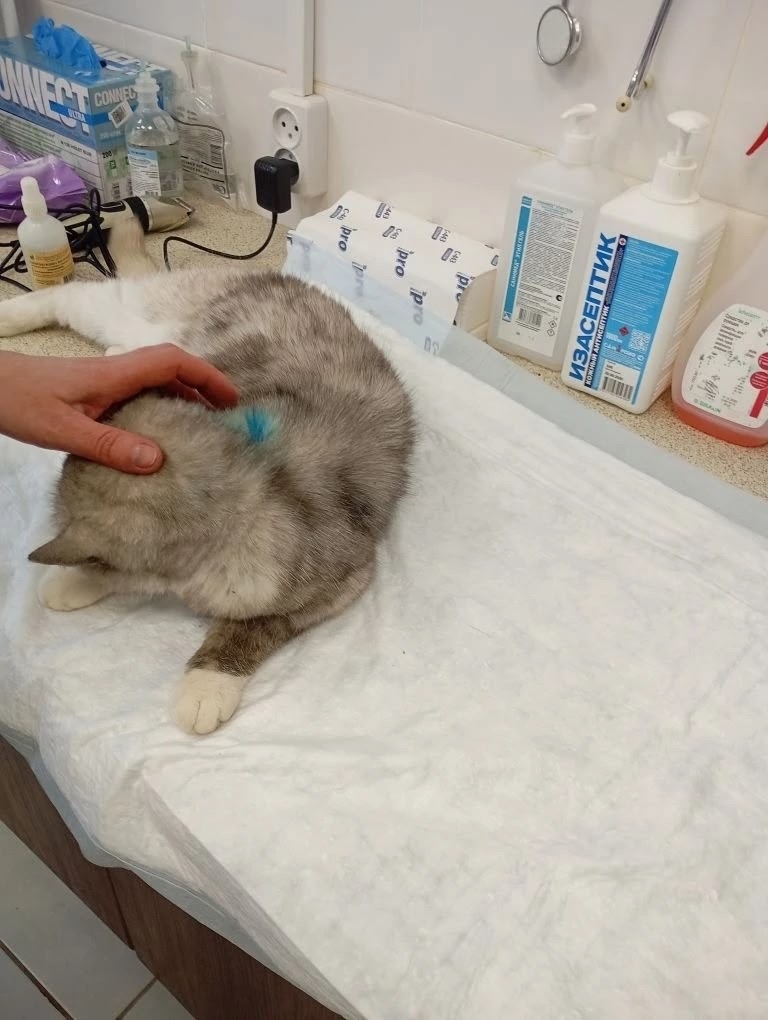 Ветеринар обработал места расчесов, которые, предположительно, были вызваны множественными укусами клещей (на кошке их было обнаружено более десятка).