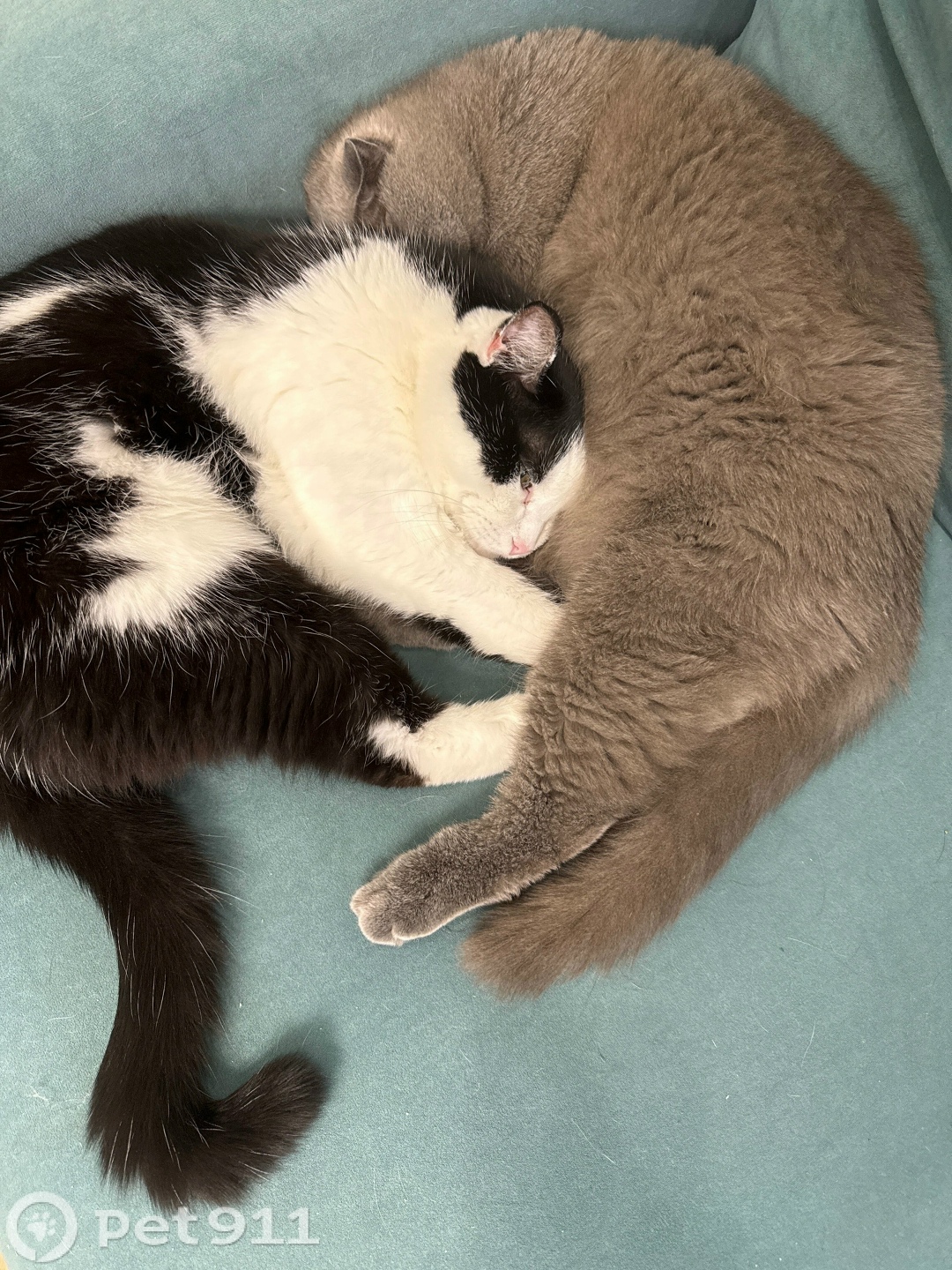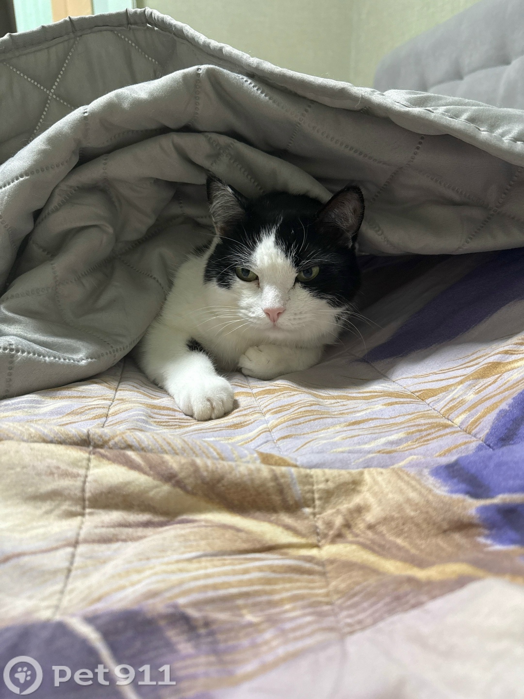 Черно-белый , кастрированный кот . Среднего телосложения . Очень пугливый . Выбежал из дома. Кот среднего телосложения , с торчащими ушками . Отсутствует один клык