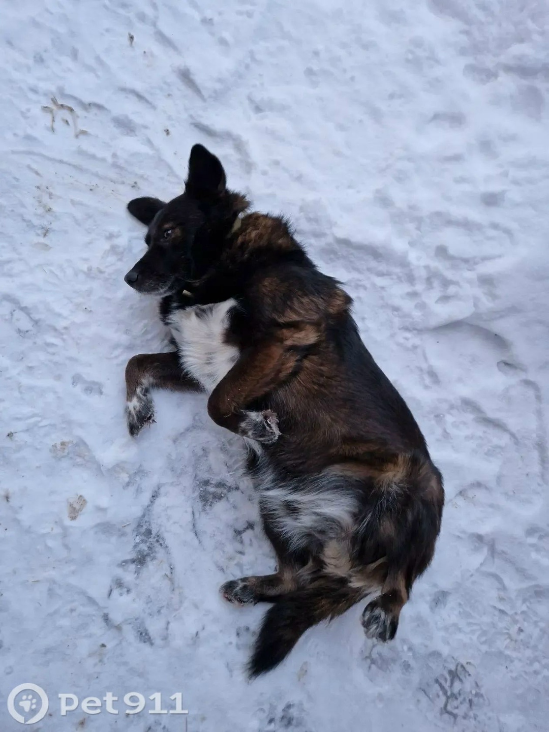 Чёрный с рыжим подпалинами, грудка белая. Немного лохматый, среднего роста. Поджимает левую переднюю и заднюю правую лапы. Глаза карие. Есть ошейник.