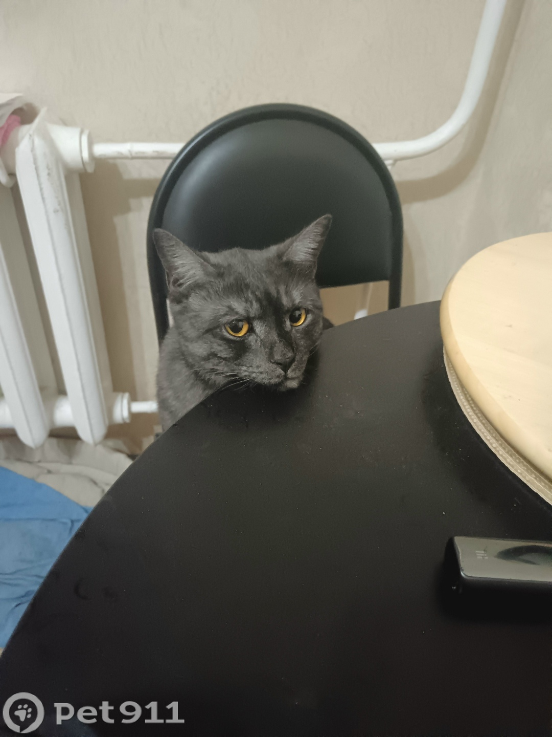 Темно-пепельный окрас с белым подшерстком, цвет глас желтый, был в красном ошейнике. Пропал в СНТ Мир Протопоповская рощи.
