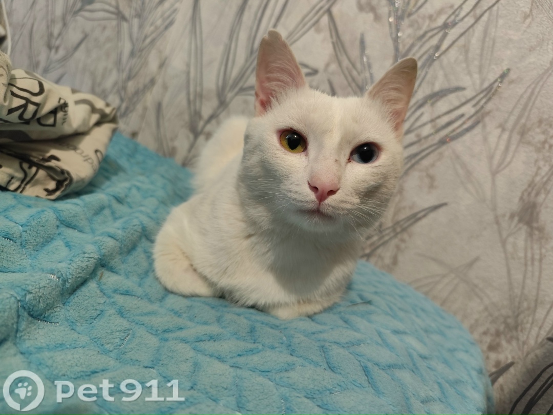 Белый окрас, разного цвета глаза правый голубой левый янтарный, очень пуглив