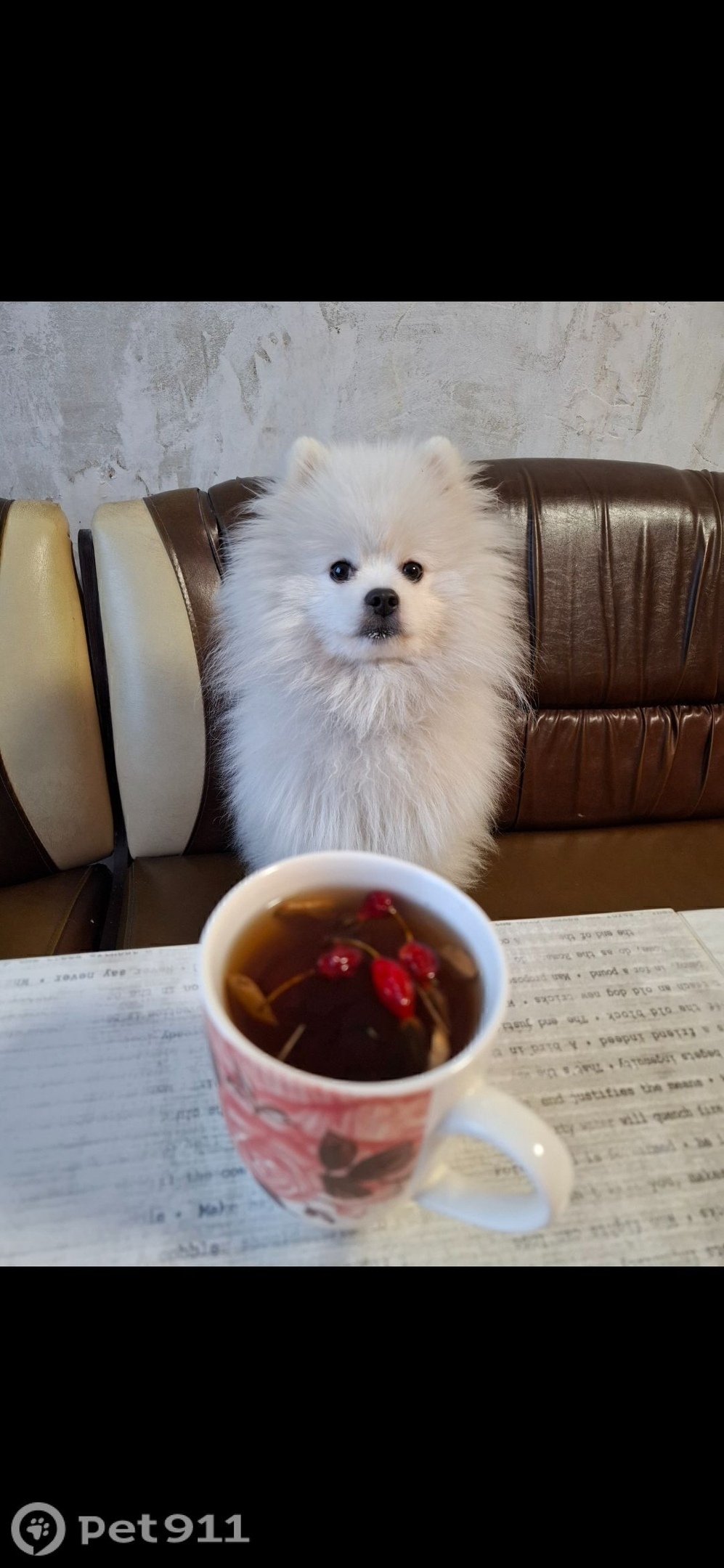 Белый мини-шпиц, на левом глазу радужка частично непрокрашена, на машонке родимые пятна коричневого цвета.