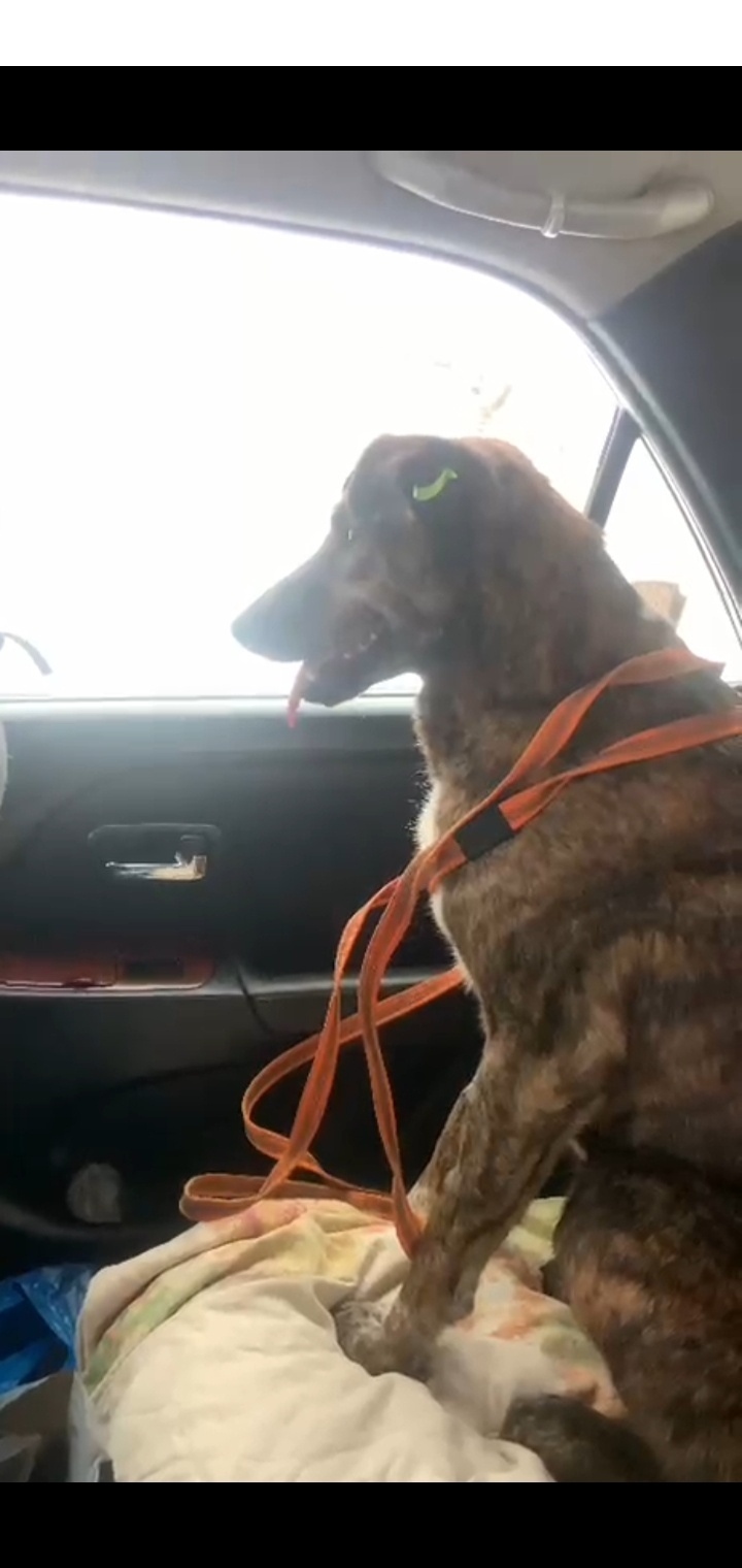 Пёс тёмного тигрового окраса, кончики лап светлые, уши опущены, в ухе есть бирка.