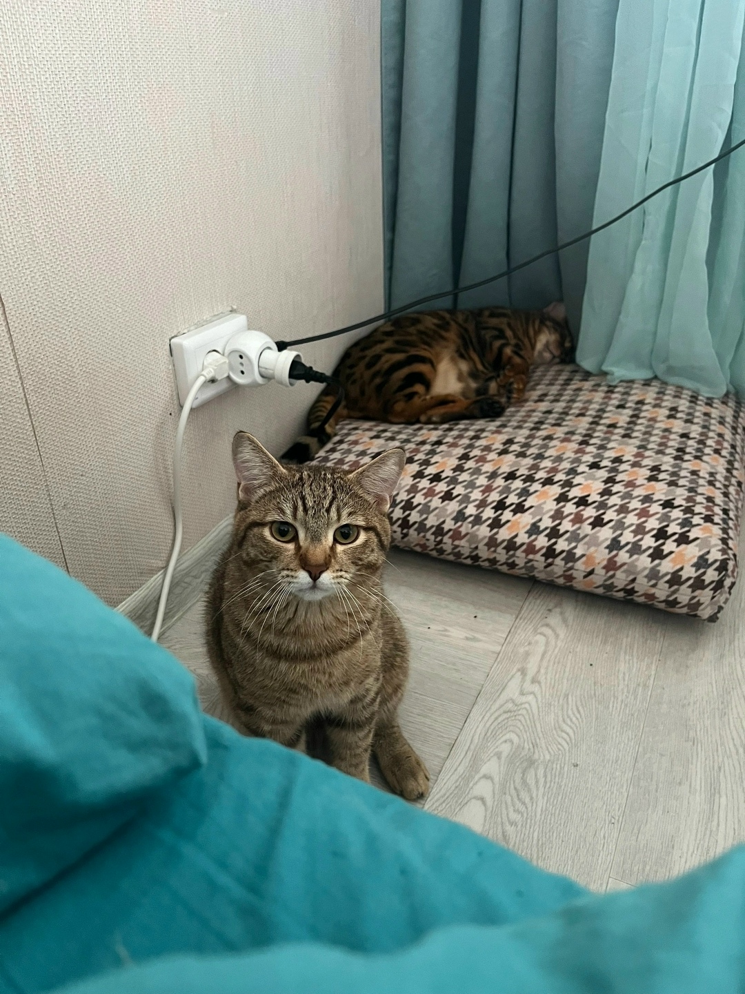 Окрас серый пятнистый, среднего размера, 8 месяцев, пугливый, не кастрирован.