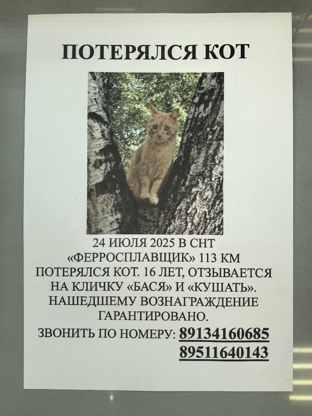 24.07.2025г в нст"Ферросплавщик, 113 км, Карлык, ( ул. Тупиковая, 29), потерялся рыжий кот. В данное время может находиться в нст "Гидродобытчик", "Алюминщик-2", "Металлург-2,3", "Восход". Кот боязливый, боится громких звуков. Люди, если увидите, придержите пожалуйста🙏. Высокое вознаграждение гарантировано. Тел для связи: 89134160685, 89511640143. Будем рады любой информации🙏.