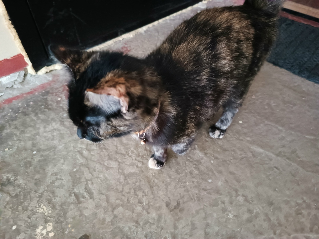 Найдена кошка, с ошейником (оранжево-розовый, с колокольчиком), ласковая, мяукает на весь подъезд.