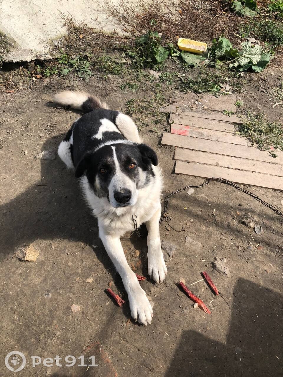 Окрас бело-чёрный. Сам он крупный. Примерно 6 лет. Был в ошейнике. Возможно бегает со стаей собак. Зовут Султан