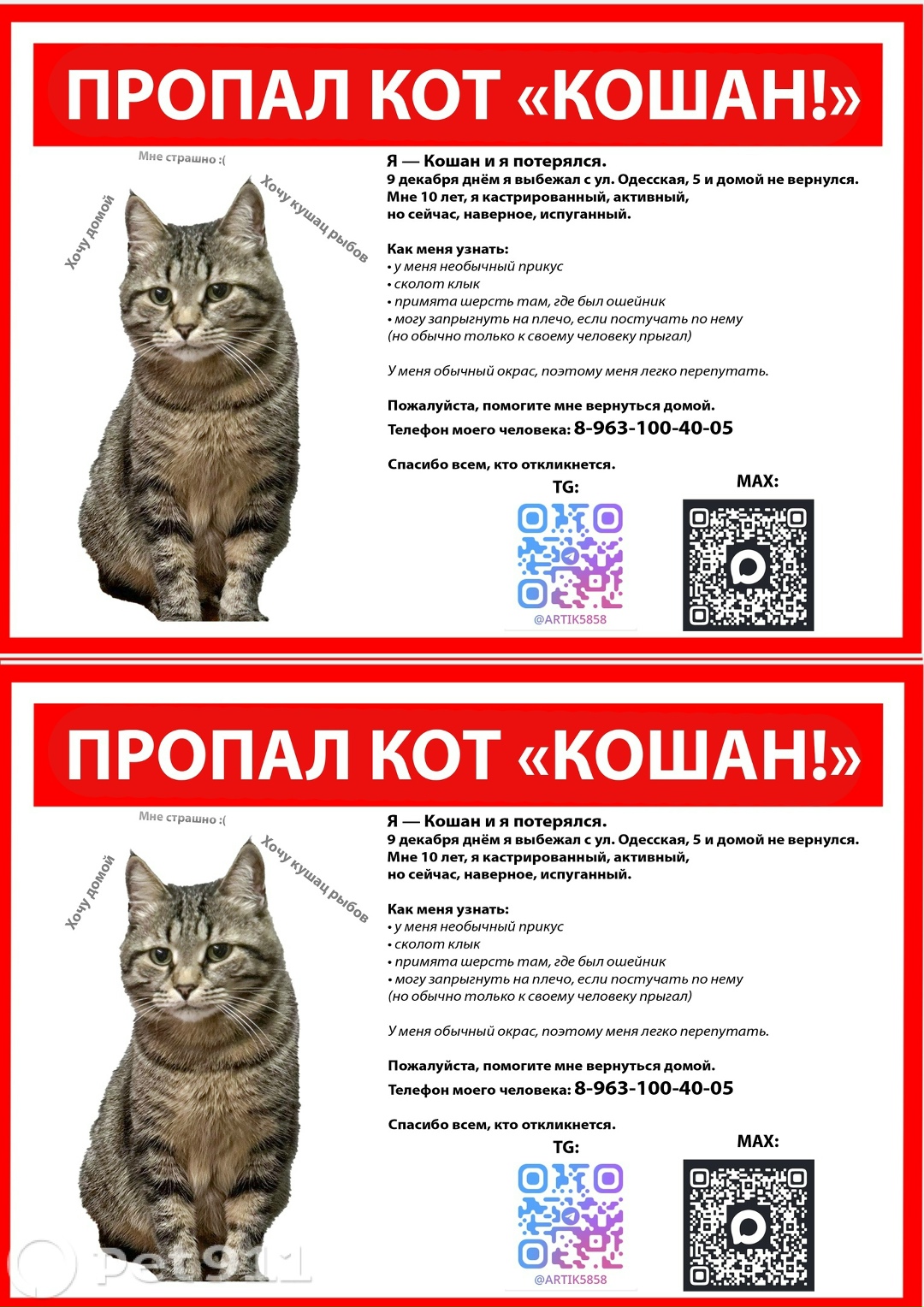 Я — Кошан и я потерялся. 9 декабря днём я выбежал с ул. Одесская, 5 и домой не вернулся. Мне 10 лет, я кастрированный, активный, но сейчас, наверное, испуганный. Как меня узнать: . У меня необычный прикус - сколот клык примята шерсть там, где был ошейник + могу запрыгнуть на плечо, если постучать по нему но обычно только ксвоему человеку прыгал) У меня обычный окрас, поэтому меня легко перепутать