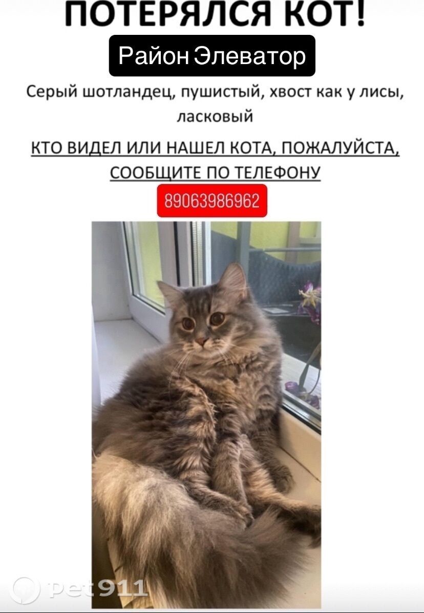 Пропал в районе Элеватора. Просто гулял и не пришел. Скорее всего кто-то взял себе. Верните за вознаграждение пожалуйста (10000₽) Серый кот с густой, мягкой шерстью. Пушистый хвост — большой и пышный, как у лисы. Глаза крупные, выразительные, янтарно-зелёного оттенка. Кот домашний, ласковый, его очень ищут и ждут в семье.