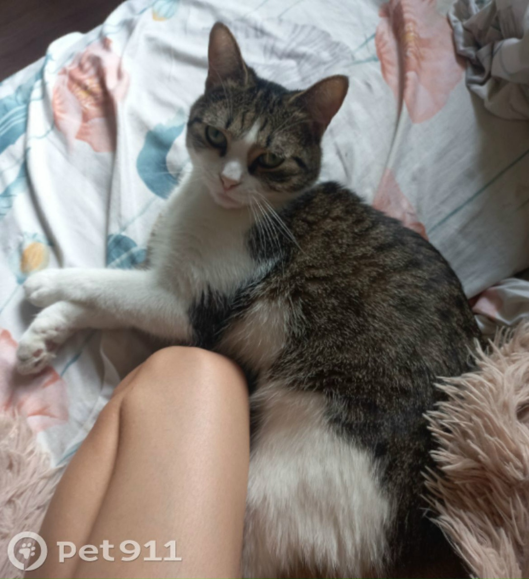 Кошка бело-серого окраса,контактная,людей не боится,не крупного размера