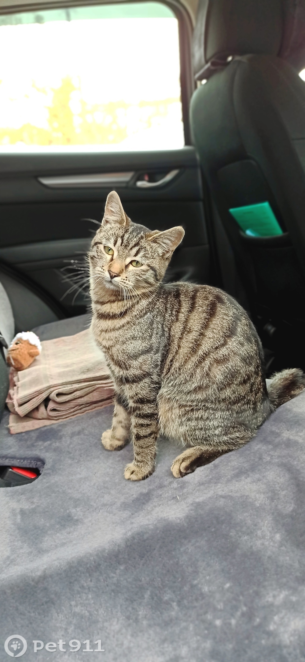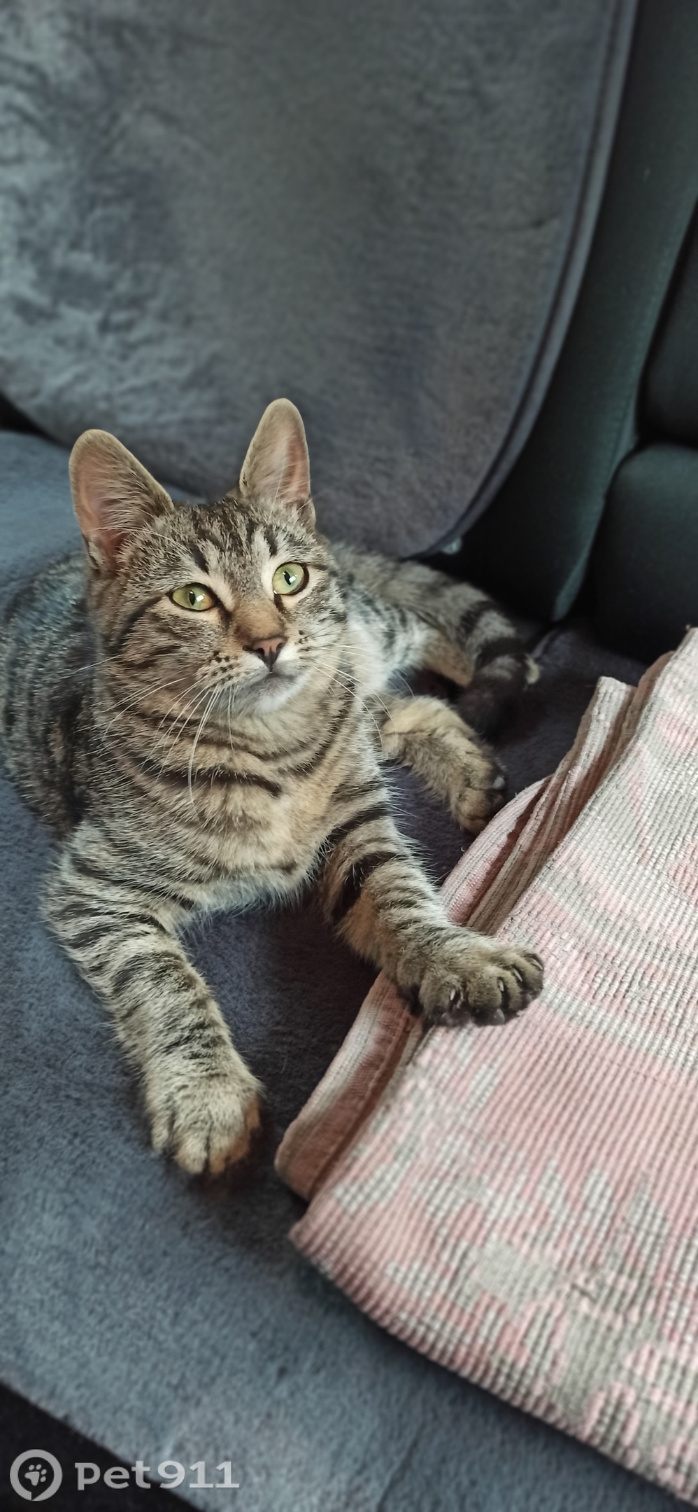 Нашелся маленький котенок примерно 6 месяцев. Красивый тигровый темно- серый окрас. Котенка нашли где передержать , но только до субботы.