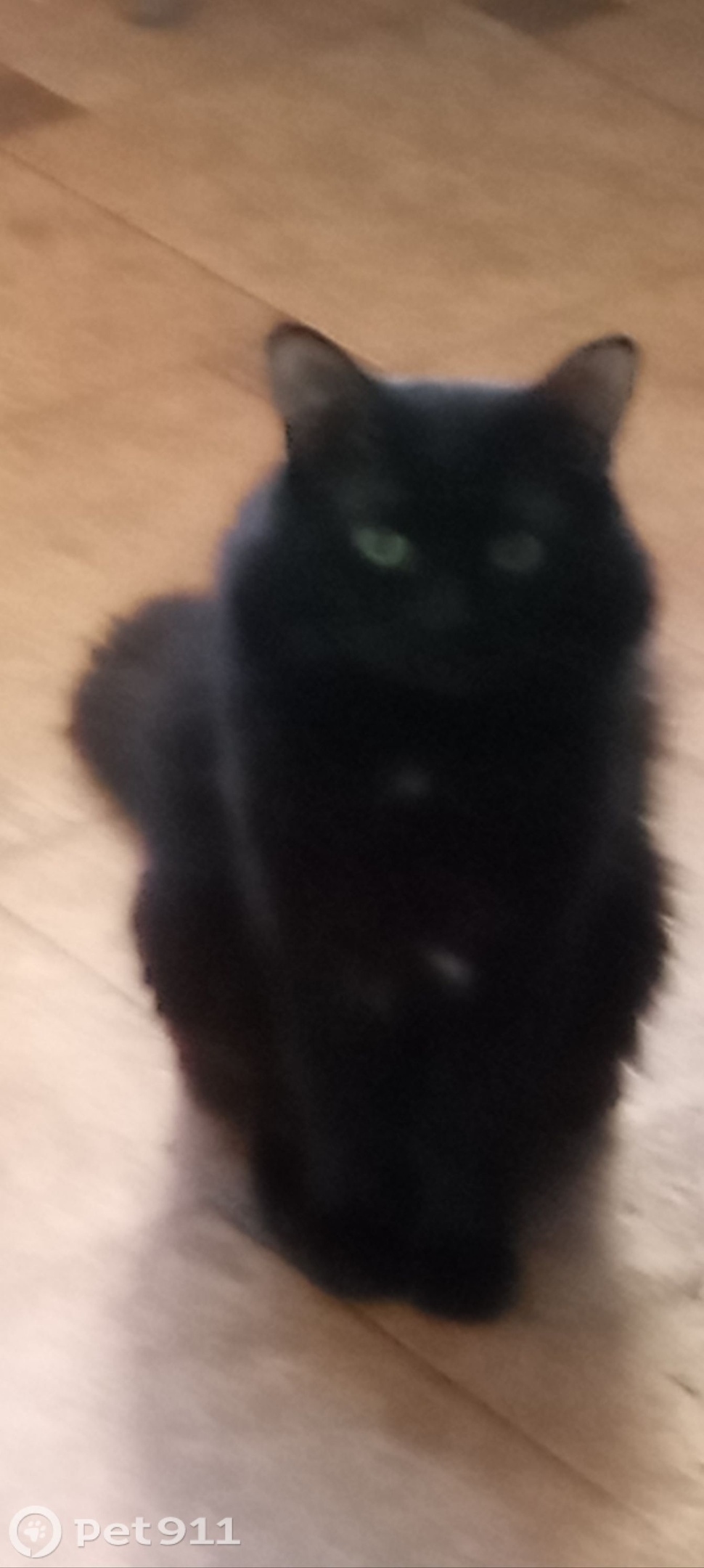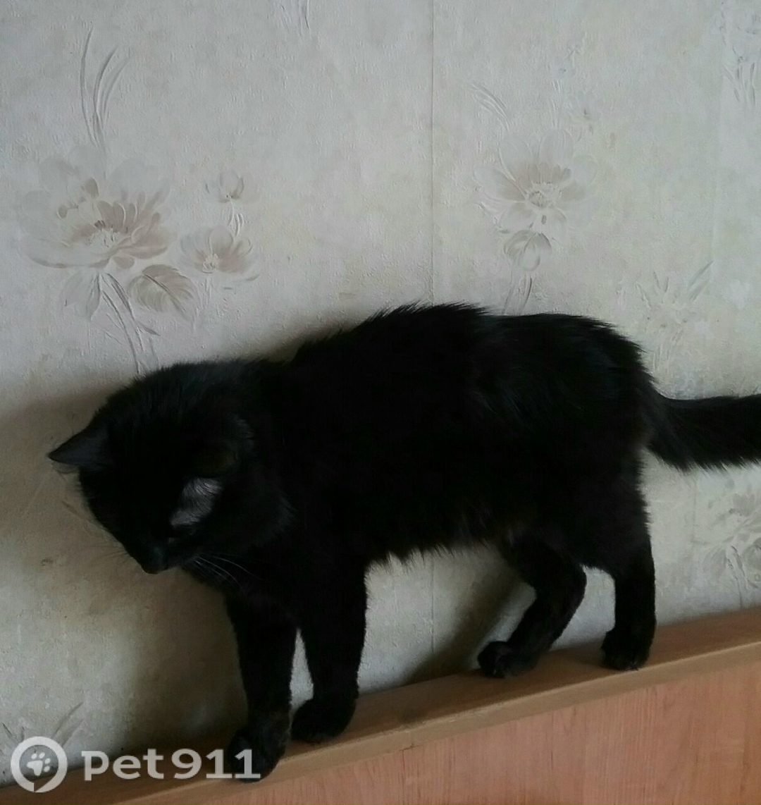 Черный, при определенном освещении с коричневым отливом, желто-зеленые глаза, три белых пятнышка (в районе груди и живота) , небольшого размера, вес до 4 кг, острая морда. Пропал при неизвестных обстоятельствах из подъезда. Может быть где угодно в любом районе.
