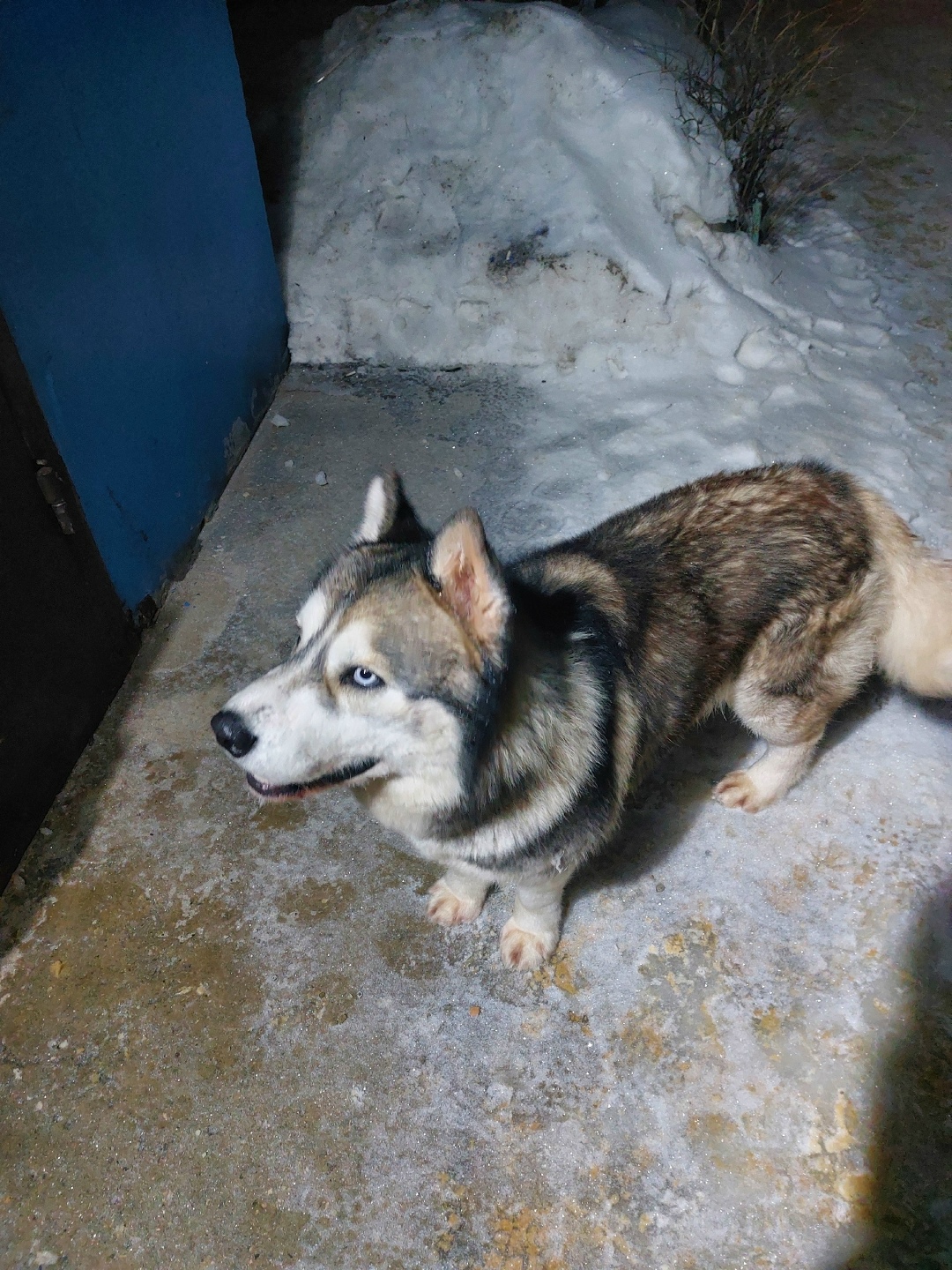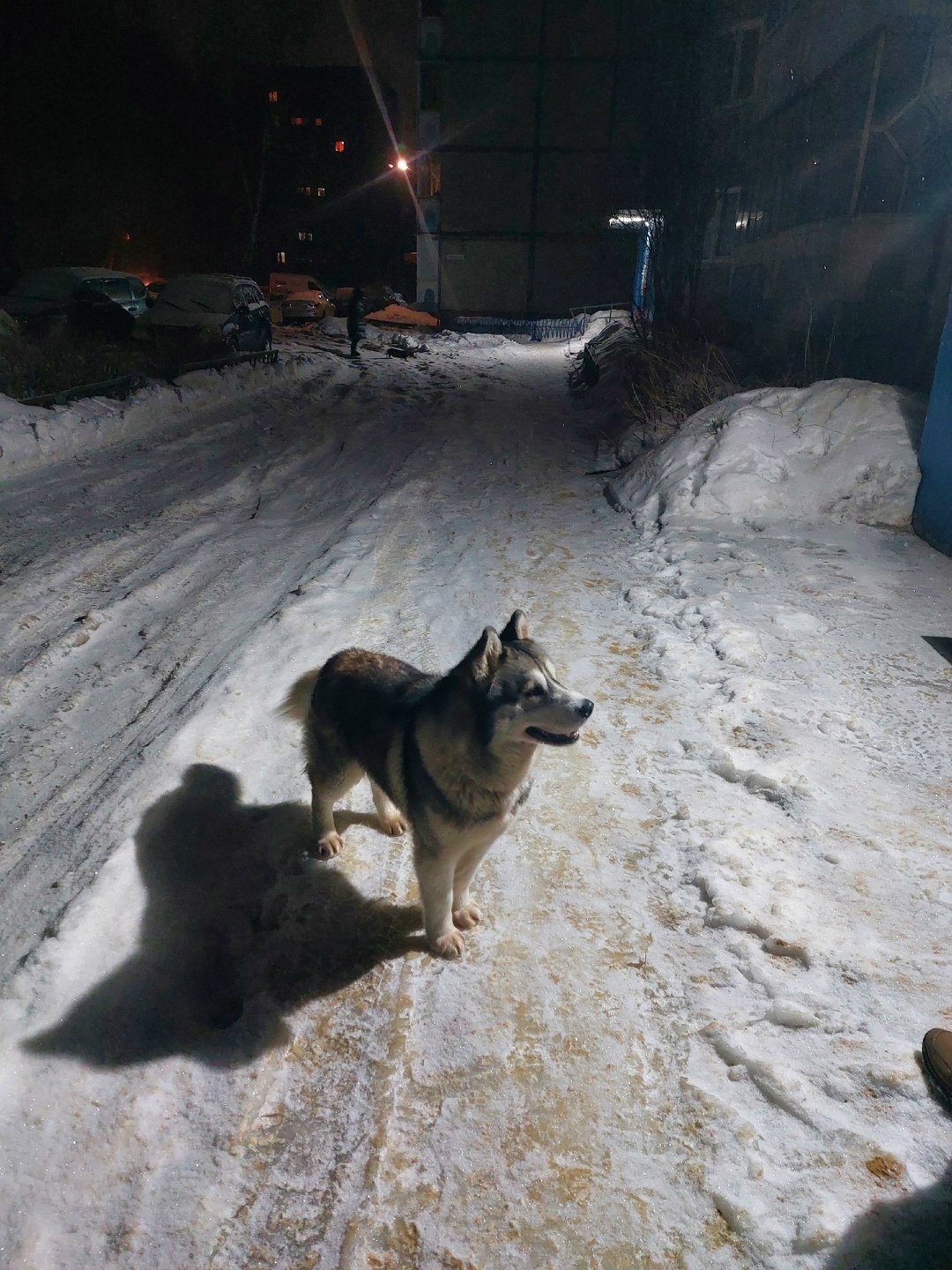 Сейчас вечером на 8 микрорайоне, во дворе встретила Хаски. Ищет еду.