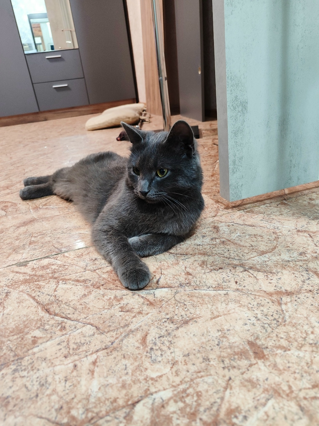 Здравствуйте. Найден кот в подъезде по адресу Вилли Огнева 4.Британец тёмно-серый, кастрированный, ласковый, видно что домашний.